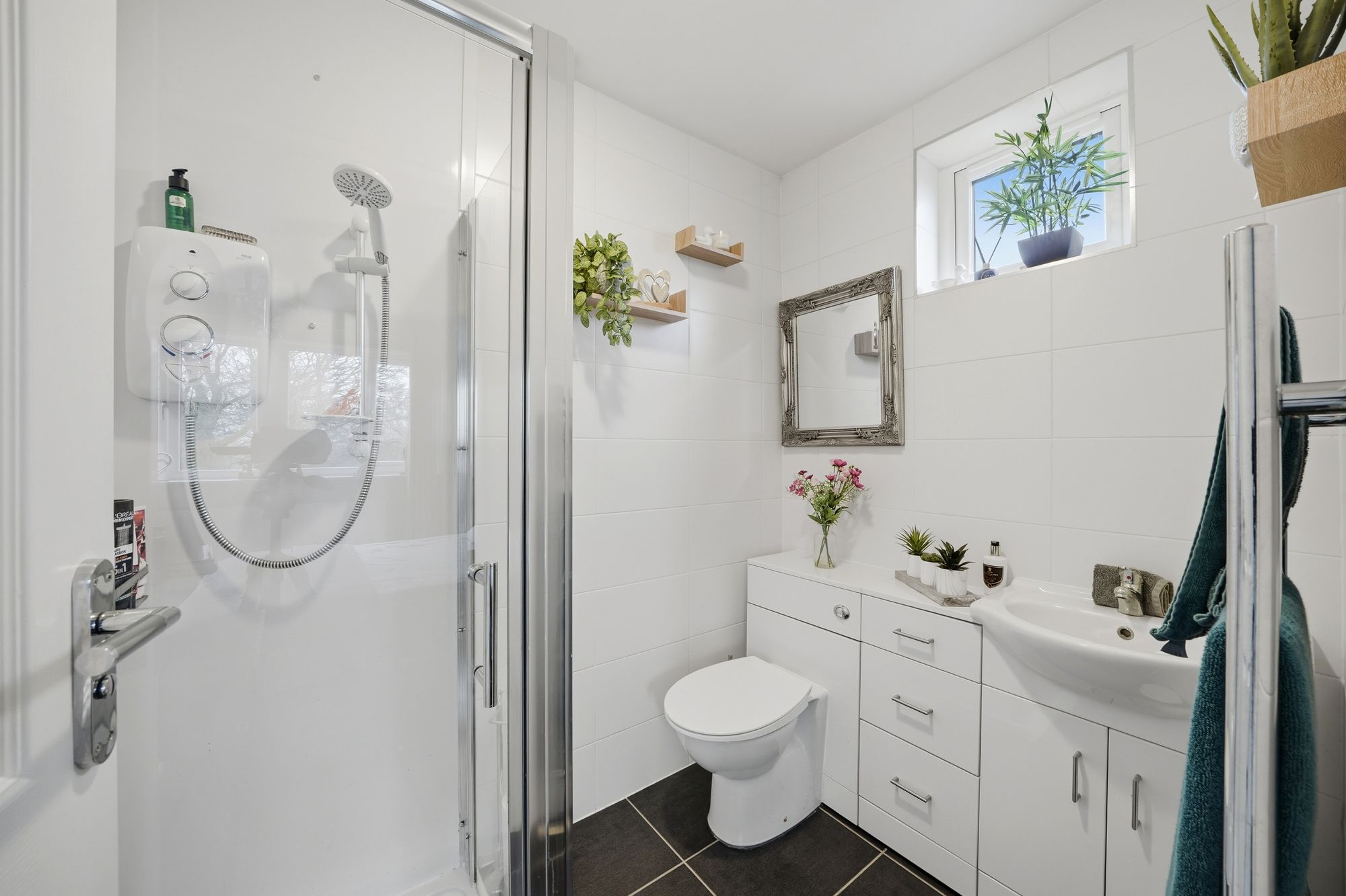 With pvcu double glazed window, ceiling light point, extractor fan, floor to ceiling tiled walls, tiled floor, chrome ladder style heated towel rail and fitted with a suite comprising vanity unit incorporating wash basin chrome monobloc tap, low flush wc with concealed system and shower cubicle with easy clean panelled walls and fitted with a Mira Sprint electric shower fitting.