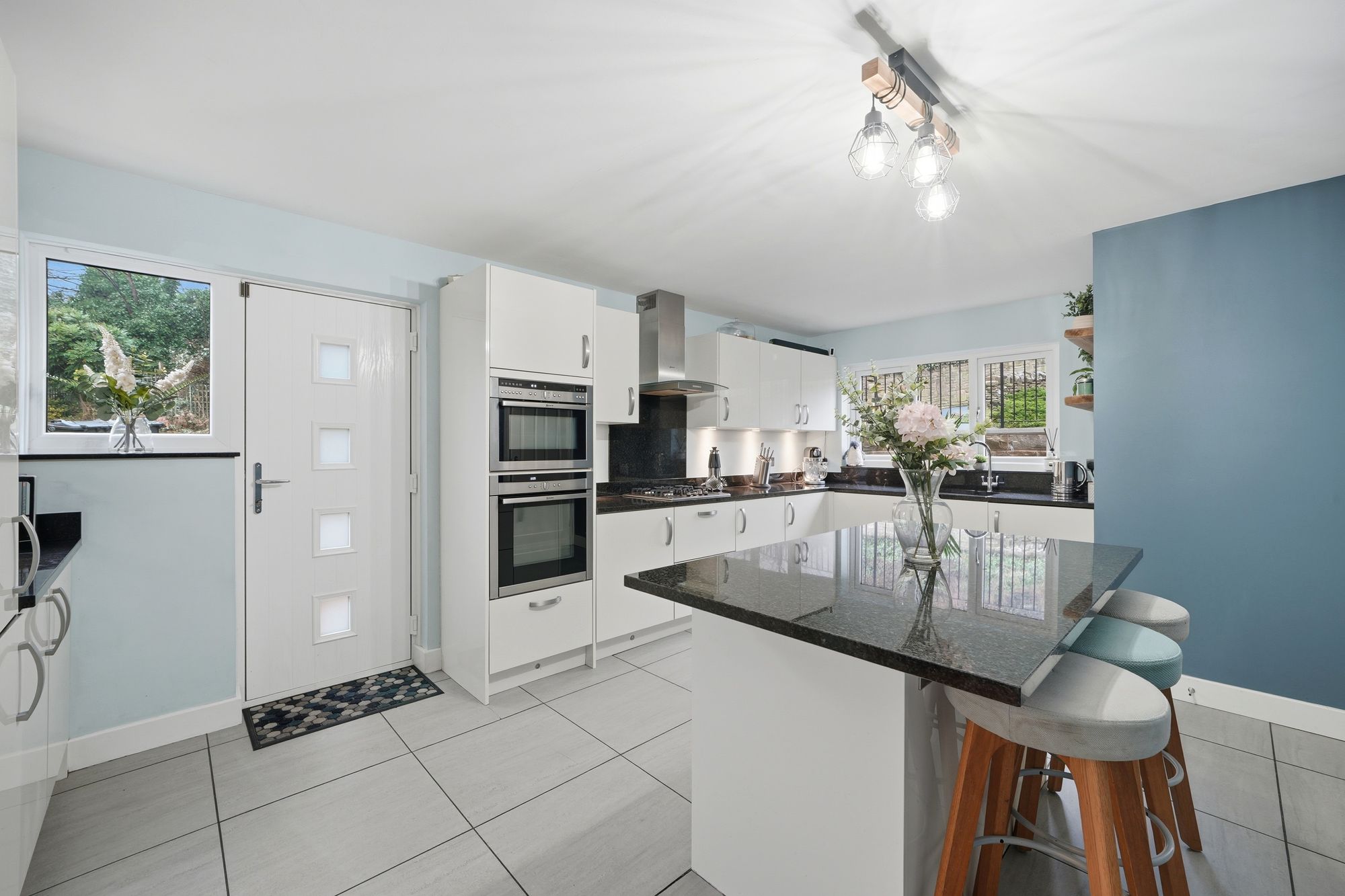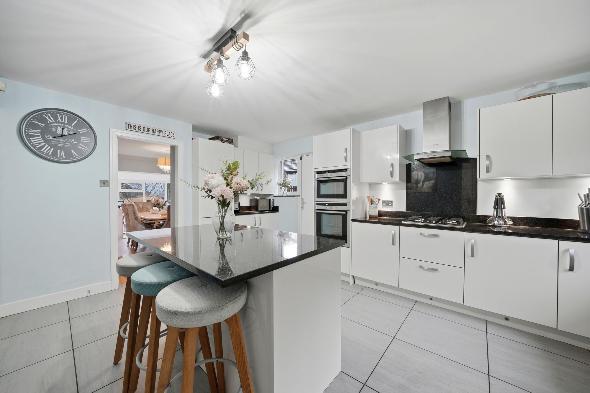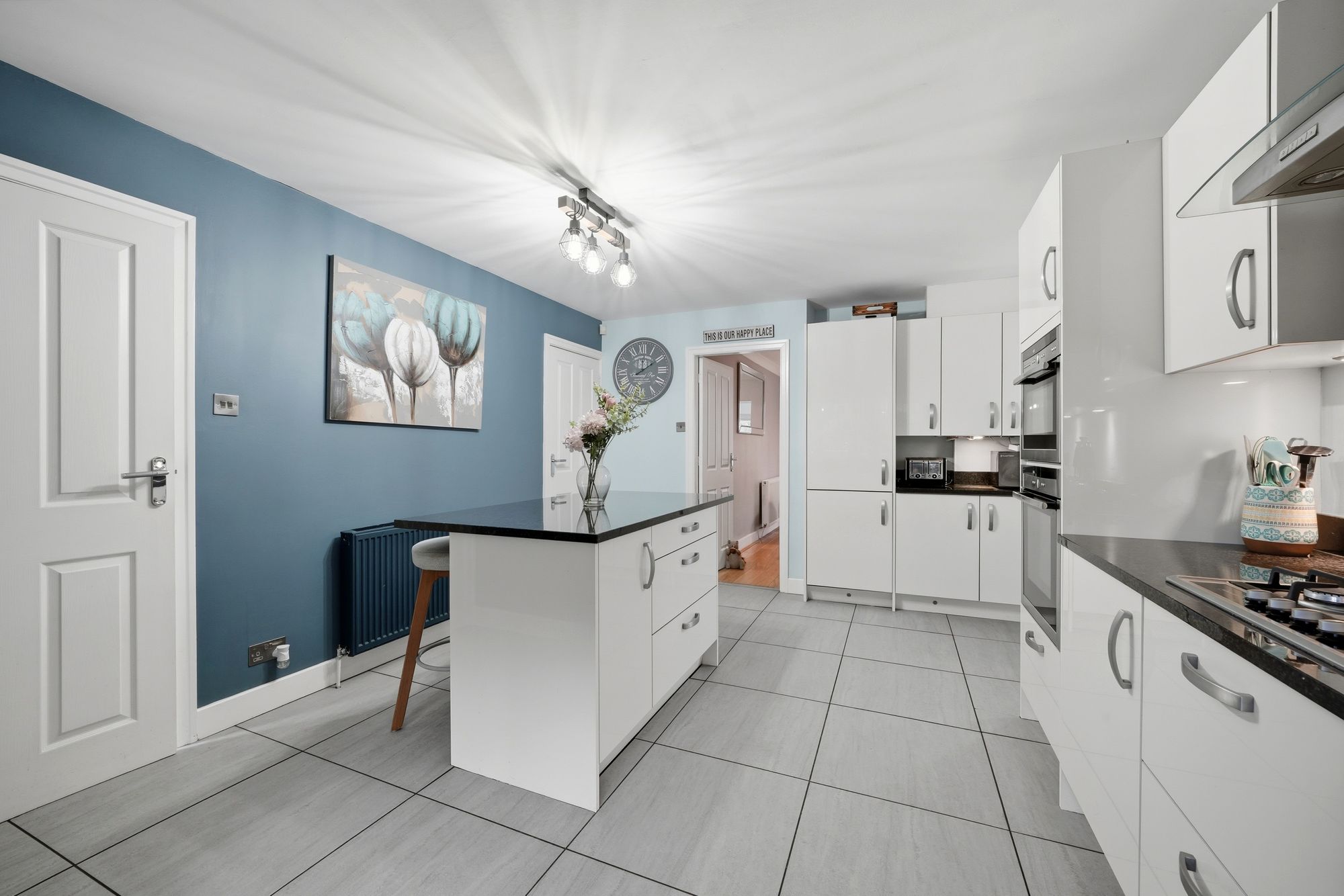 There is a cupboard housing a Maine gas fired combination central heating boiler fitted in 2024. There is concealed lighting beneath the wall cupboards, low level lighting and an island unit which has a cupboard, drawer, pan drawers and overlying granite worktop which extends to form a breakfast bar. To one side there is a door giving access to useful storage cupboard beneath the stairs and further door opening to the dining room.