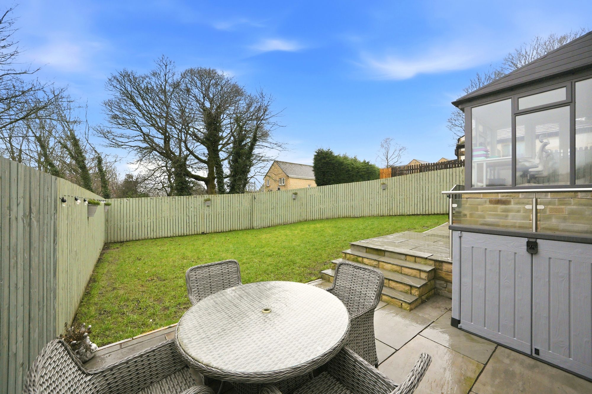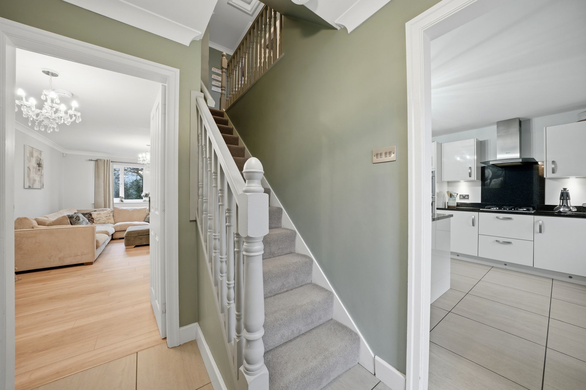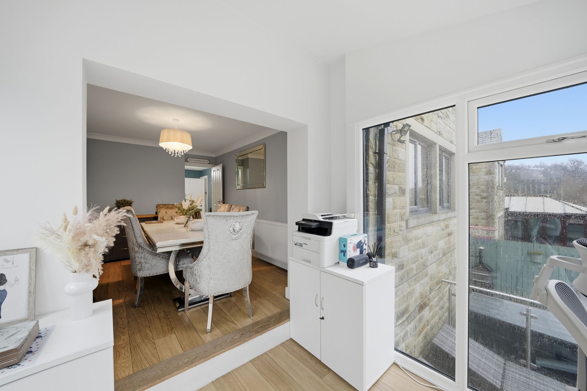 As the dimensions indicate this is a generously proportioned reception room which has a pvcu double glazed window looking out over the rear garden and enjoying some lovely views over the Colne Valley. There are two ceiling light points, ceiling coving, two central heating radiators, oak effect laminate flooring fitted towards the end of 2025 and as the main focal point of the room there is a feature fireplace with oak mantle, surround, marble inset and home to a gas fire which rests on a marble hearth.