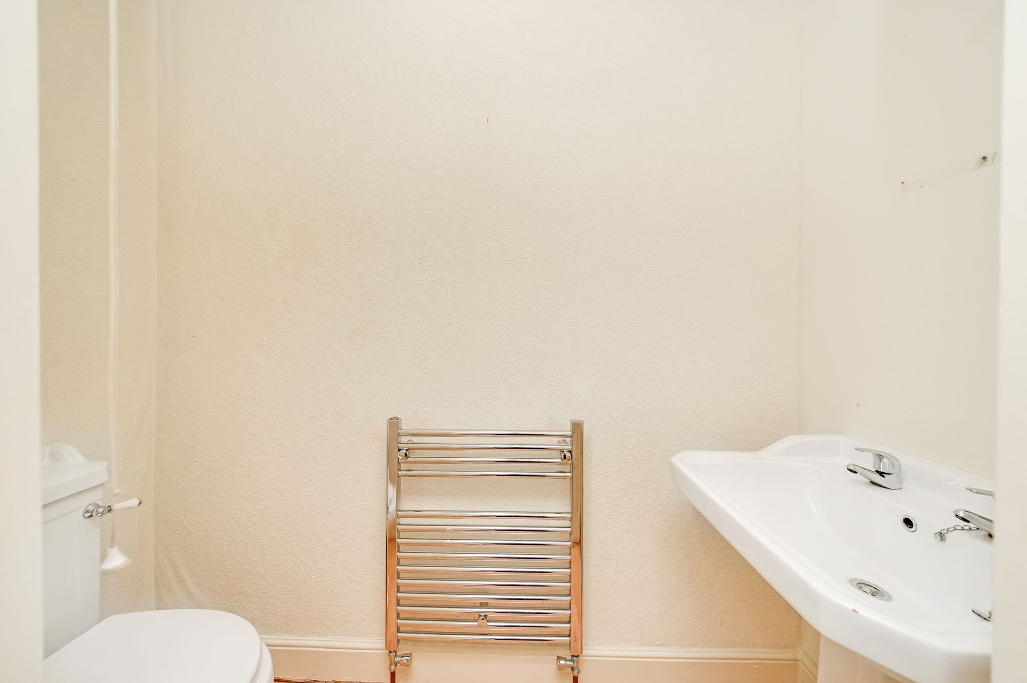 Served by a low-level w.c. and pedestal wash handbasin. There is also a chrome, heated towel rail.