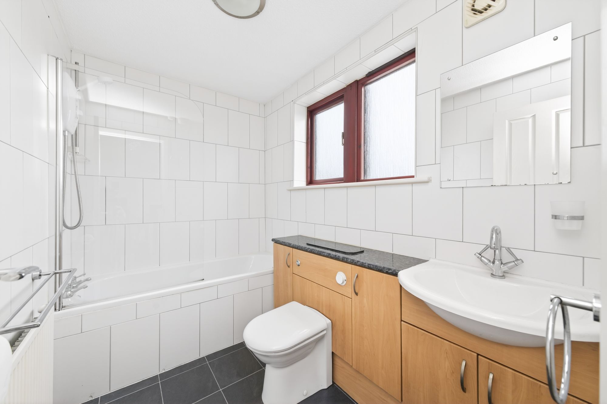 The bathroom features a white three-piece suite. Which comprises of an inset bath with electric, Mira ‘Jump’ shower over and glazed shower guard and tiled inset. A low-level WC with concealed cistern which incorporates a vanity cupboard with wash hand basin with mixer tap over. There is vinyl-tiled flooring and tiling to the walls, a ceiling light point, radiator, extractor fan and a bank of double-glazed, mullioned windows with obscure glass to the front elevation.