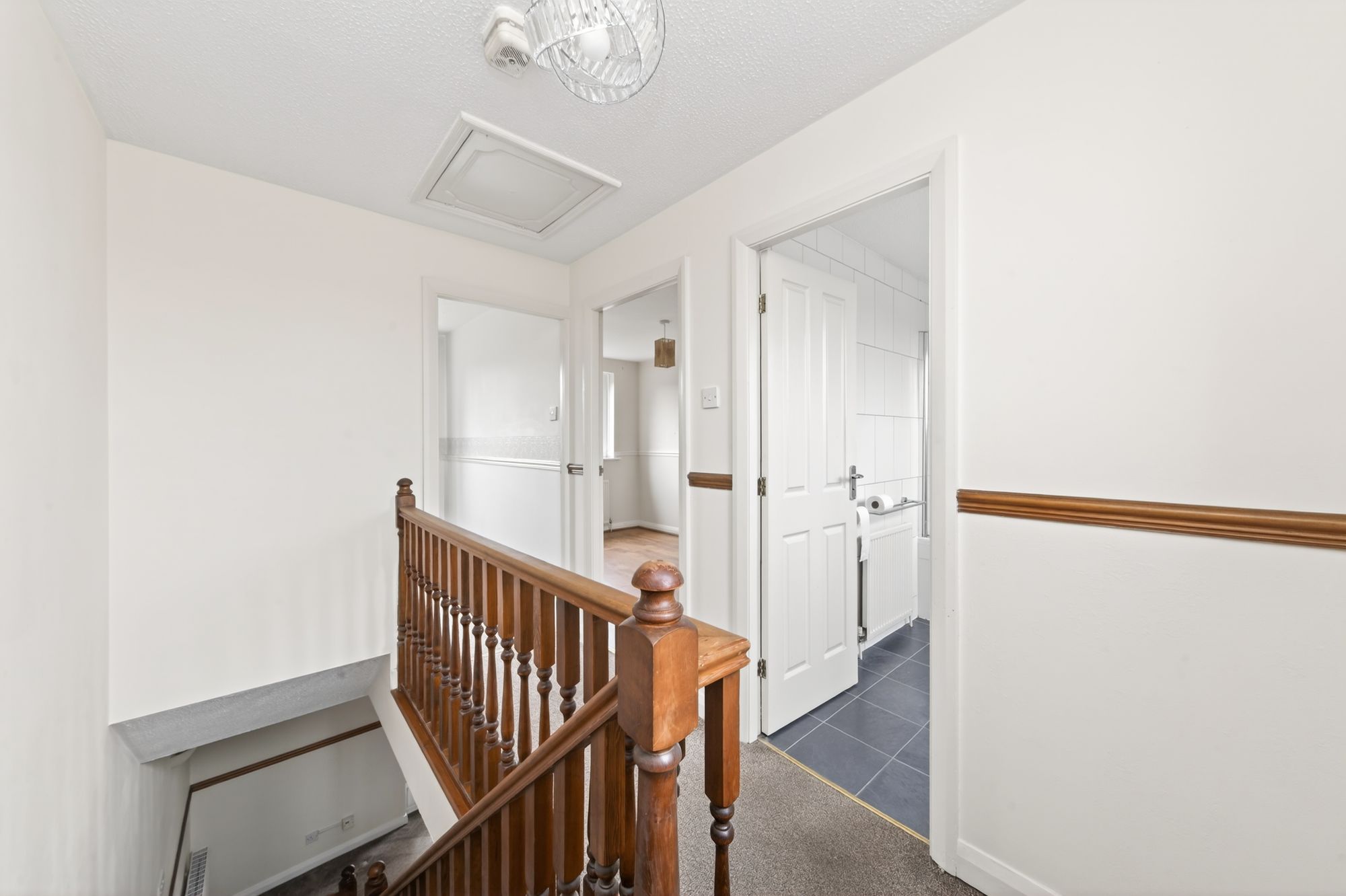 Taking the staircase from the open plan living dining room, you reach the first-floor landing which has a decorative dado rail, ceiling light point, radiator and a loft hatch gives access to a useful attic space. There are multi-panelled doors providing access to bedrooms and the house bathroom and a double-glazed, hardwood window to the front elevation with pleasant views across a communal green.