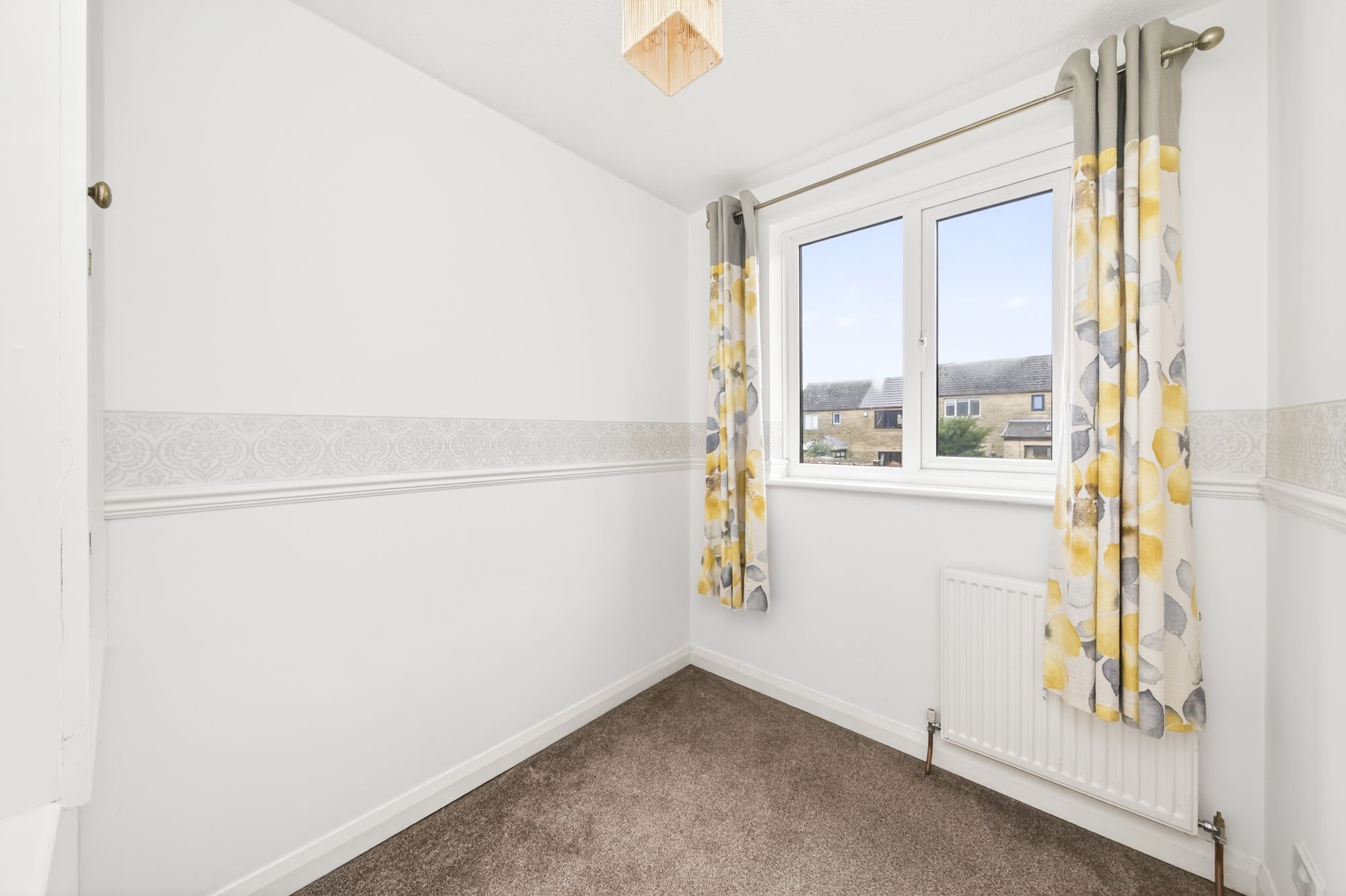 Bedroom two could be utilized as a home office or nursery. It will accommodate a single bed with space for free-standing furniture and benefits from a fitted wardrobe over the bulk head for the stairs with hanging rail and shelf. There is a decorative dado rail, ceiling light point, radiator and a bank of double-glazed windows to the rear elevation.