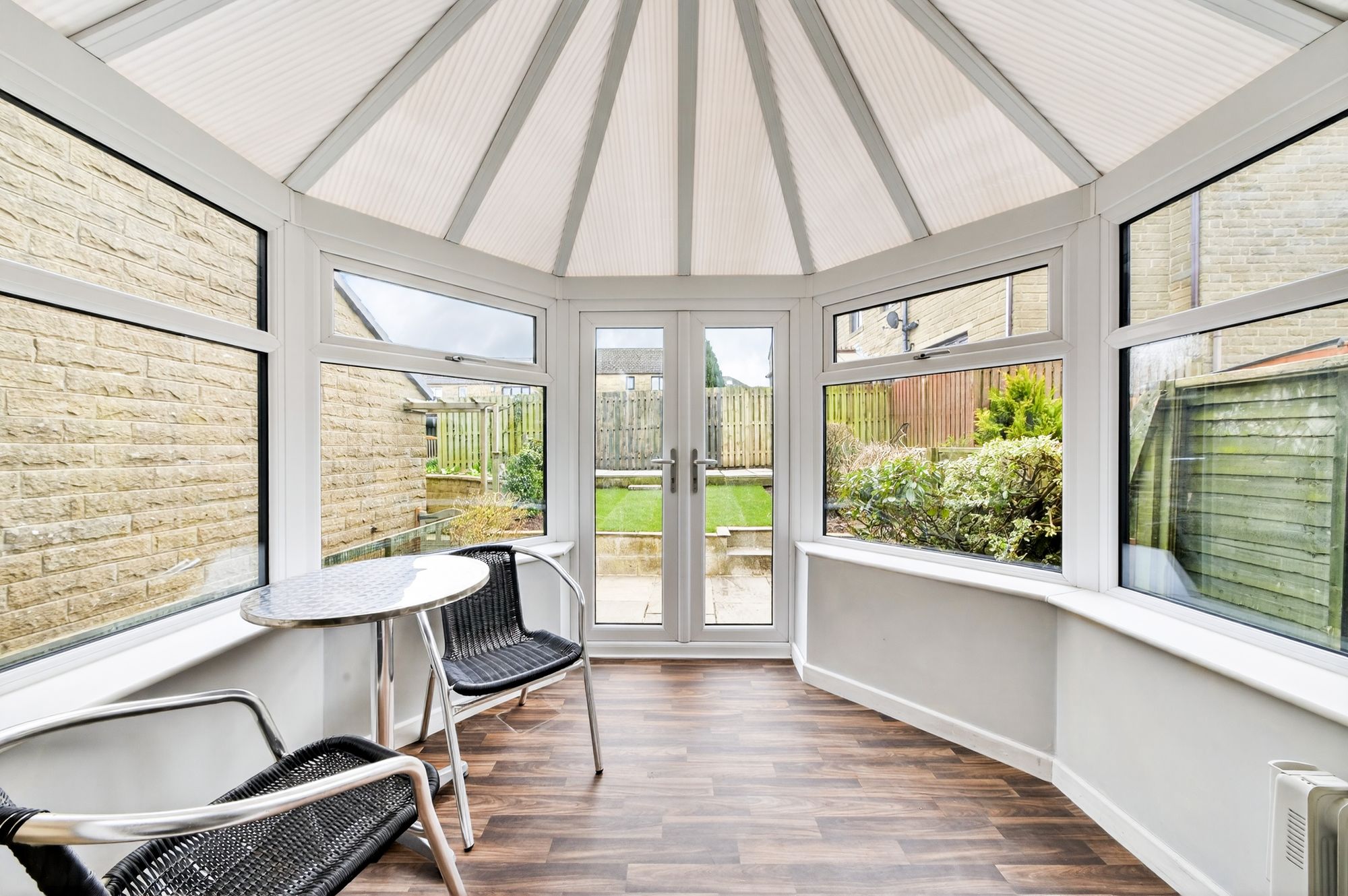 A generous proportioned reception room which features a decorative dado rail, three wall light points and a central ceiling light. There is a radiator and a kite-winding staircase with wooden banister and traditional spindle balustrade rises to the first floor. Double-glazed French doors then give access to the conservatory with integrated blinds.