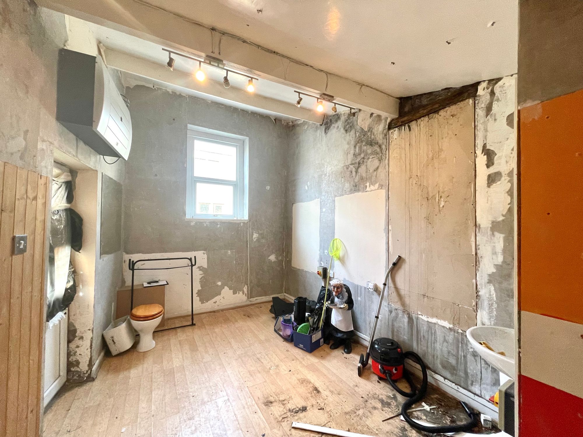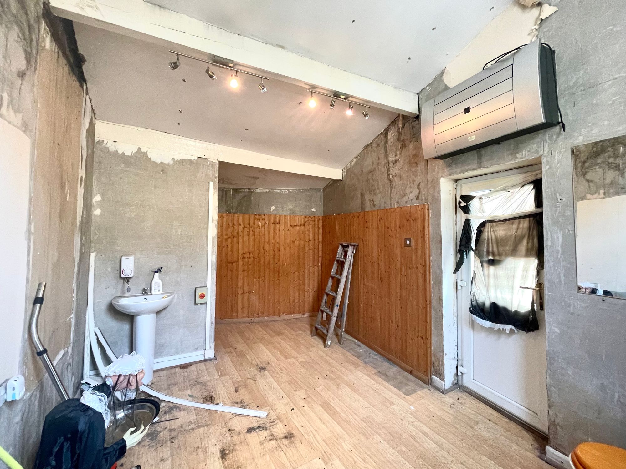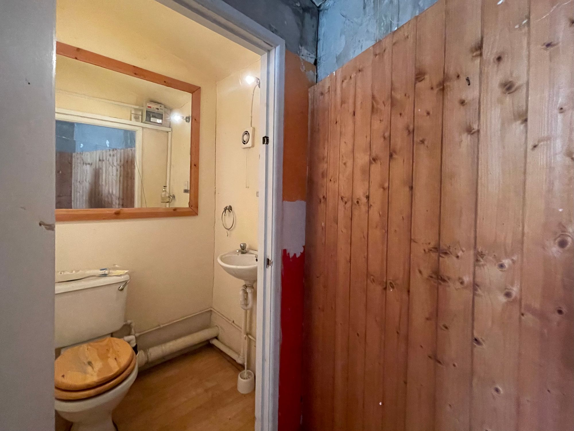 With uPVC double glazed door, uPVC double glazed window, ceiling light points and pedestal wash basin. In one corner there is a w.c.