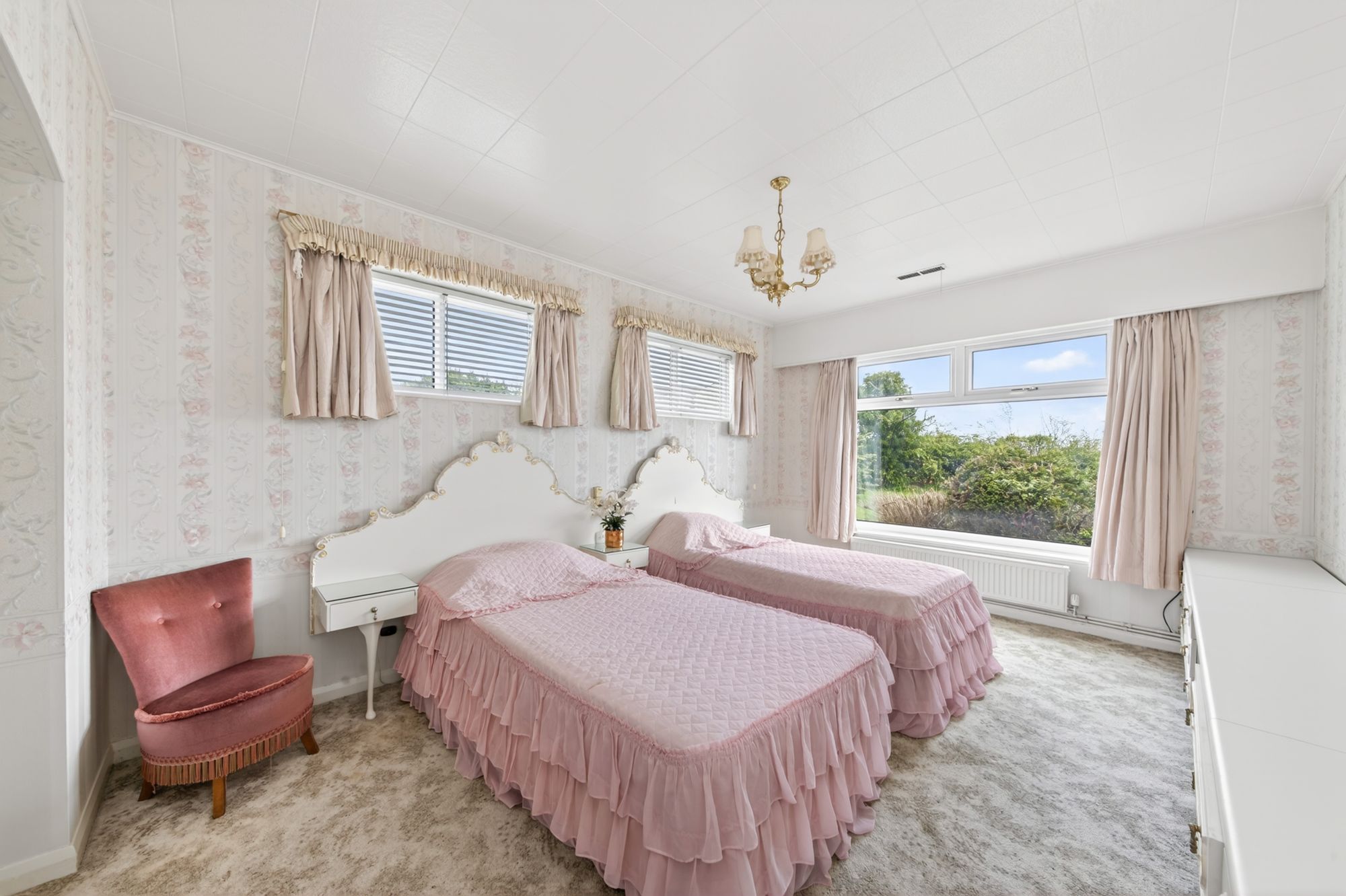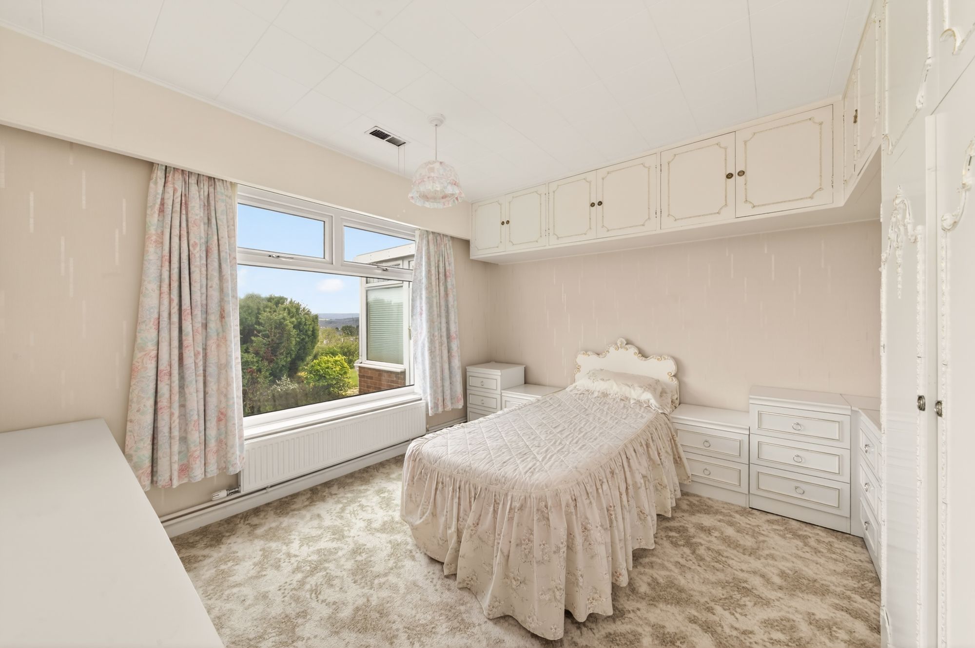 The principal bedroom is a fabulously proportioned, dual-aspect, double bedroom which benefits from an array of fitted furniture, including a beautiful twin headboard with matching bedside tables and a dressing table with drawer units beneath. There is a radiator and a central ceiling light point, and the room offers a delightful, open-aspect view across the gardens.
