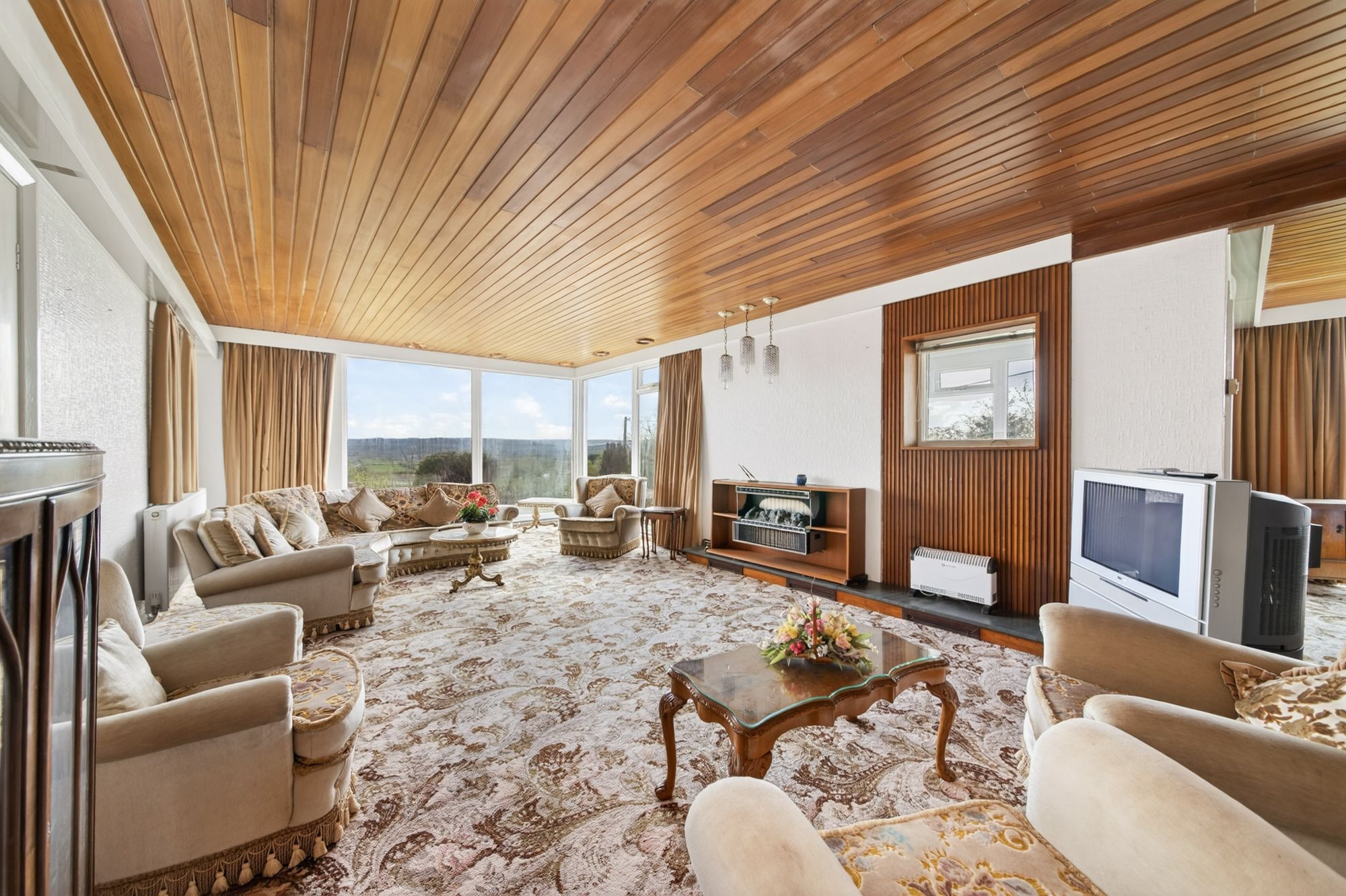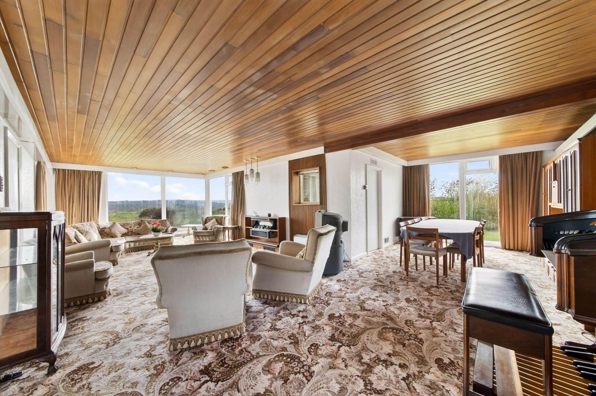This fabulously proportioned, L-shape reception room enjoys a wealth of natural light courtesy of dual-aspect windows in the living area, again taking advantage of the property's elevated position with open-aspect views. There is a panelled ceiling with recessed lighting, ceiling light points over the feature fireplace, carpeted flooring, and a radiator. The dining area features a panelled ceiling with cornice lighting, a feature panelled wall, a wall light point, a bank of floor-to-ceiling windows to the side elevation with views onto the gardens, and a timber door giving access to the sitting room.