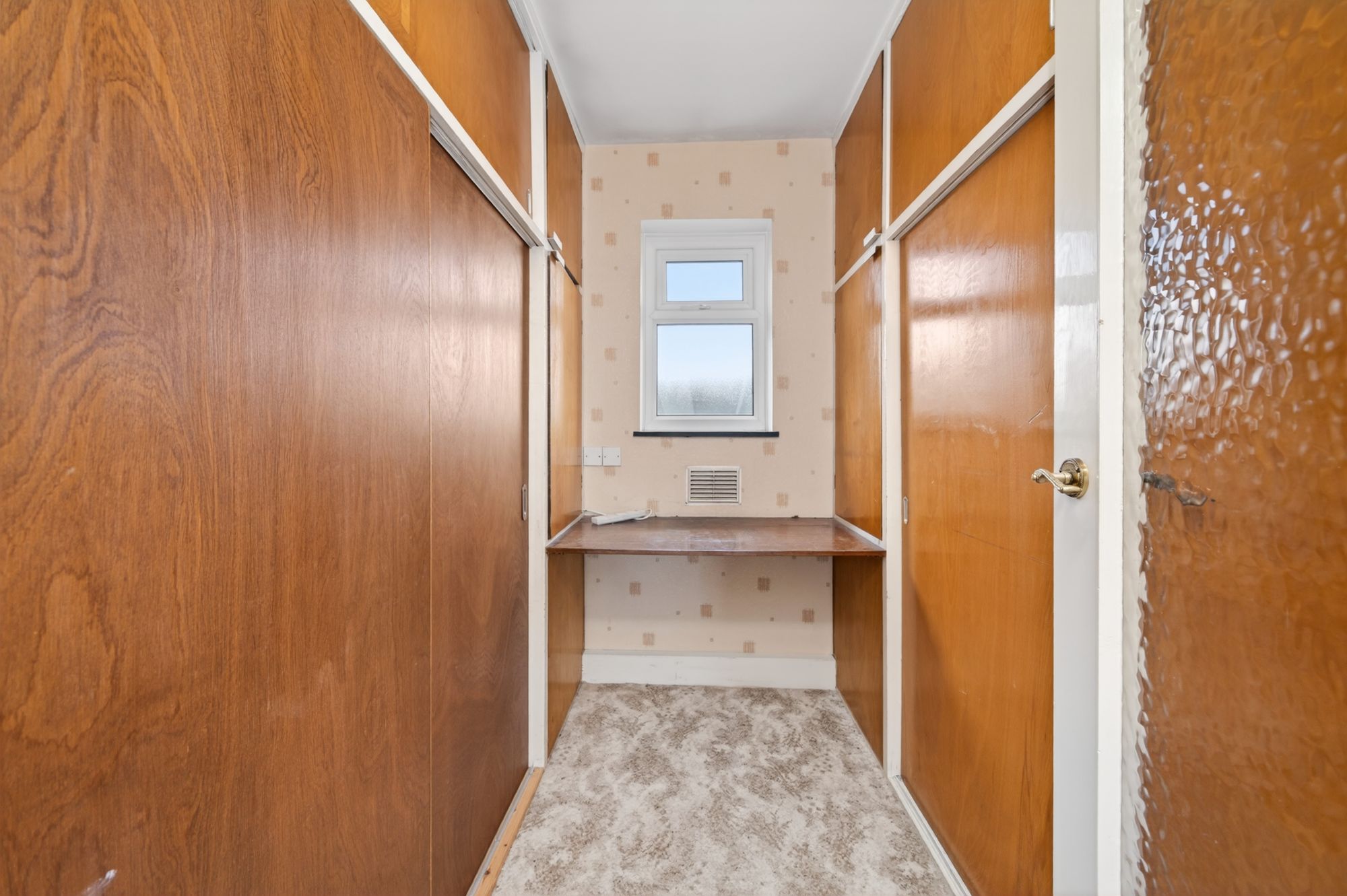 Currently utilised as a study with floor-to-ceiling fitted furniture at either side, it features a double-glazed window with obscure glass to the rear elevation and a fitted desk. Should the prospective buyer require, the fitted furniture can be taken out to allow space for a bed and freestanding furniture. The cupboard to the left-hand-side houses the Worcester Bosch combination boiler.
