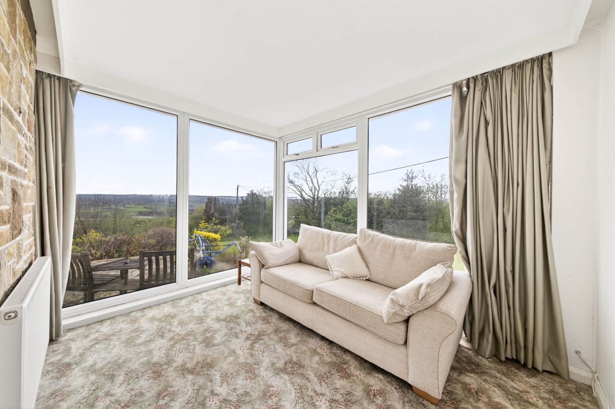 The sitting room is a versatile reception room which could be utilised as a bedroom, home office or family room. It features an exposed stone chimney breast, a radiator, cornice lighting to the ceiling, and a bank of double-glazed, floor-to-ceiling windows to the front and side elevation which offer superb views across the gardens and the valley beyond.