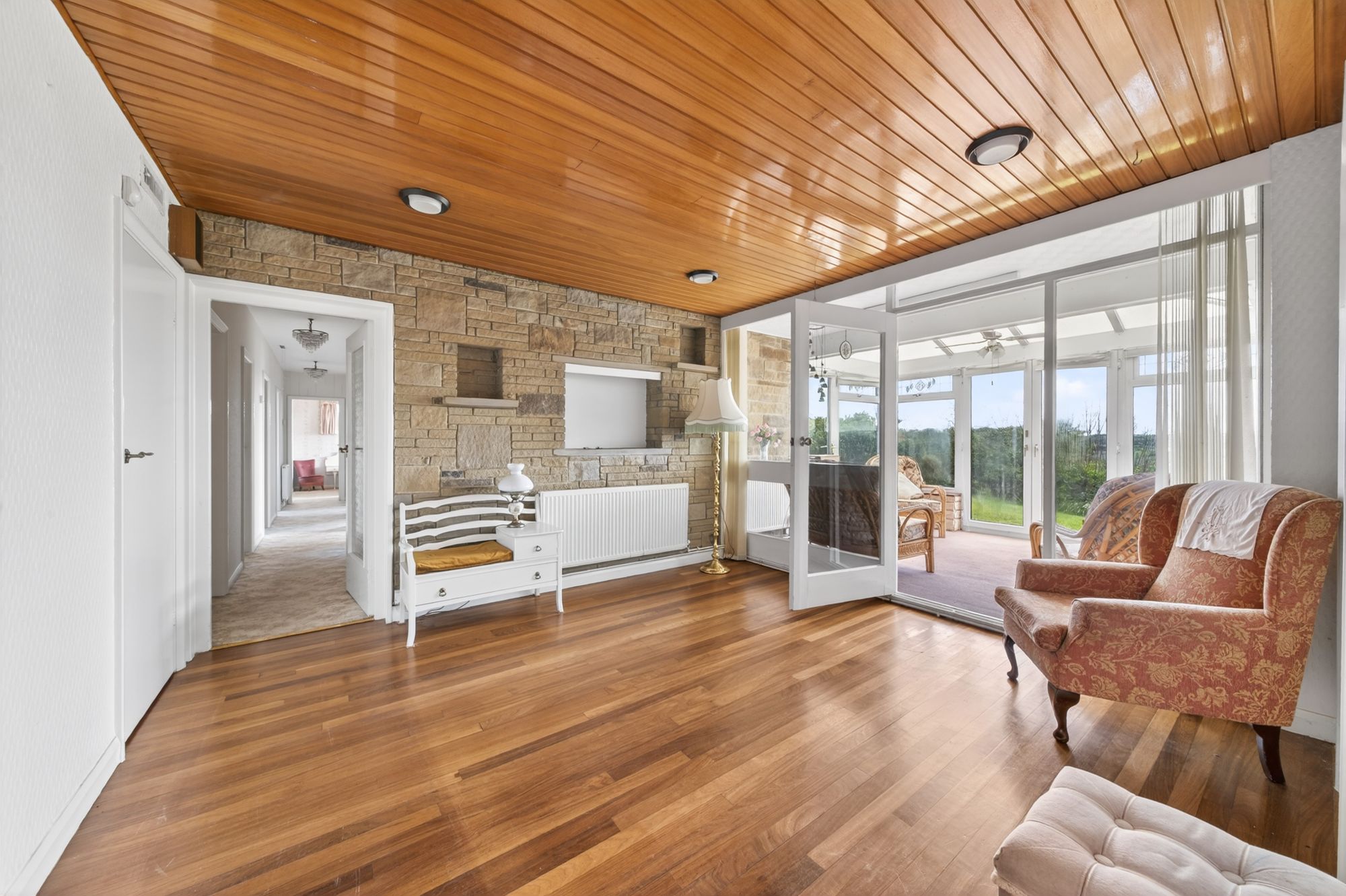 The reception hall / dining hall features a continuation of the attractive hardwood flooring from the kitchen, as well as a fabulous panelled ceiling with four ceiling light points, a decorative exposed-stone wall on display, and access is provided to the inner hallway, cloaks cupboard, open-plan living dining room and the conservatory. The reception hall could be utilised in a variety of ways, such as a play room or home office.