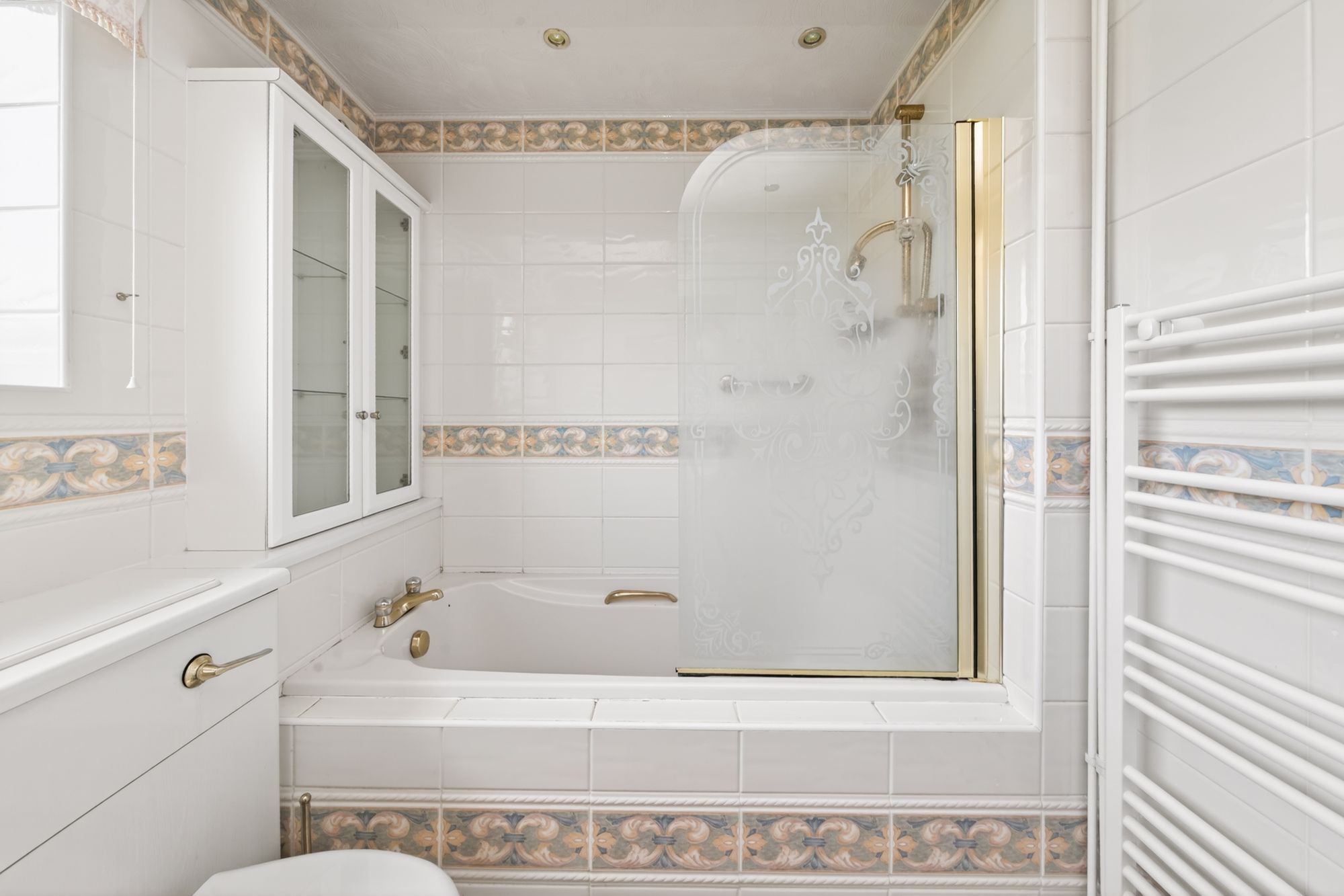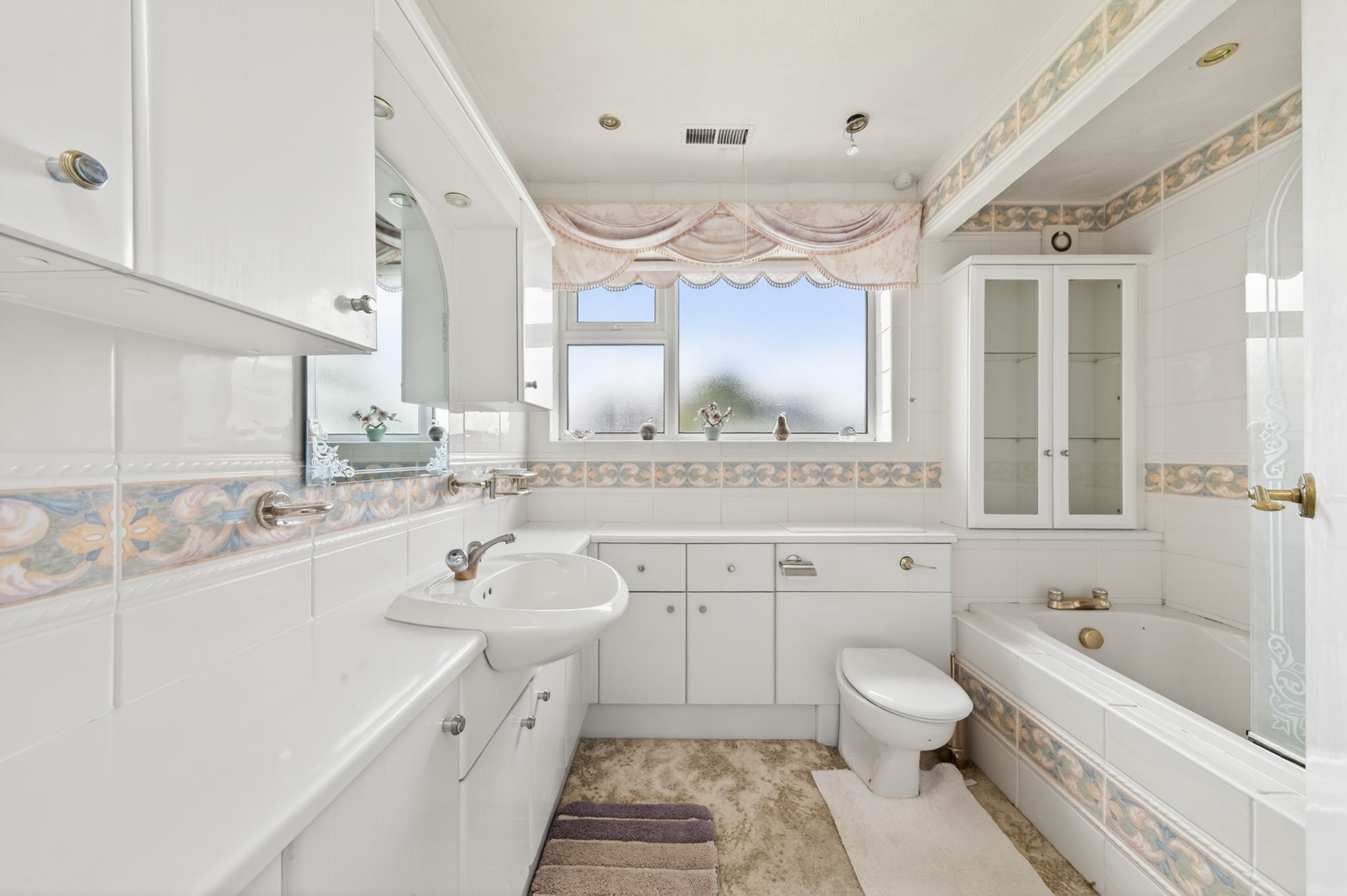 BATHROOMThe bathroom features a fitted three-piece suite including an inset bath with thermostatic shower over and tiled inset, a low-level WC with concealed cistern which incorporates a broad wash hand basin with vanity cupboards and units beneath. There is tiling to the walls, inset spotlighting to the ceiling, a ladder-style radiator, a vanity cupboard with glazed doors, an extractor fan, and a bank of double-glazed windows with obscure glass to the rear elevation providing a wealth of natural light.