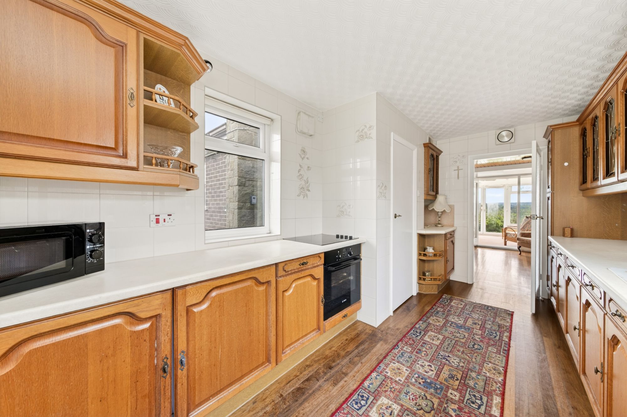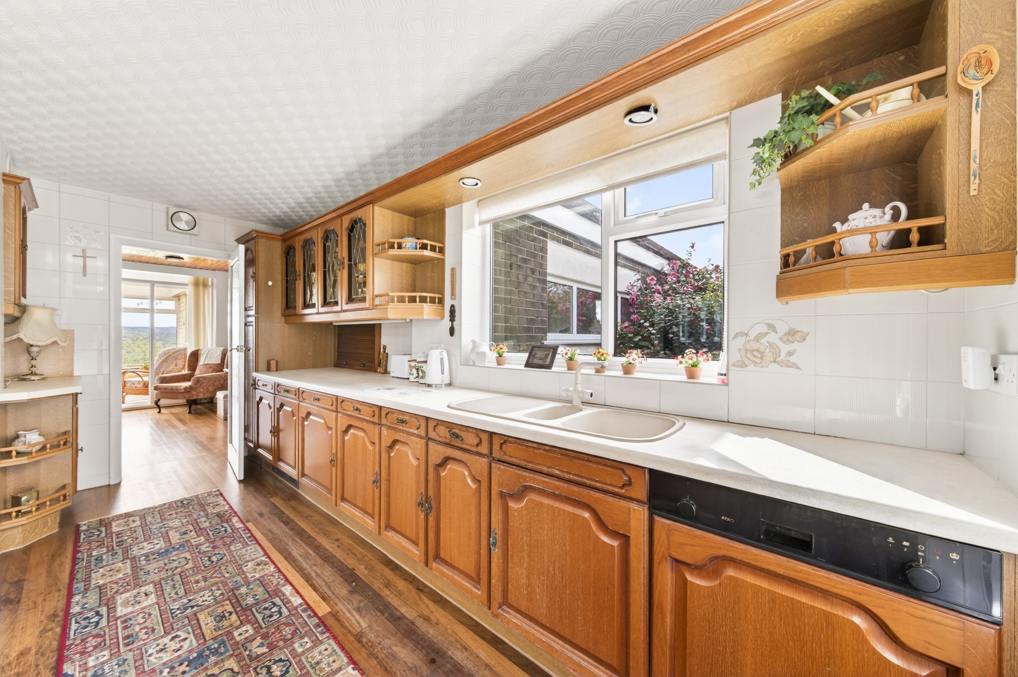 The kitchen enjoys a wealth of natural light cascading through dual-aspect, double-glazed windows to either side elevation. There is high-quality flooring, a wall light point, a door enclosing a useful pantry, and a timber and glazed door leading into the inner hallway. The kitchen features fitted wall and base units with shaker-style cupboard fronts and complementary rolled-edge work surfaces over, which incorporate a one-and-a-half-bowl, composite sink and drainer unit with mixer tap over. There are glazed display cabinets with stained glass inserts and leaded detailing, recessed lighting to the cornice, under-unit lighting, and tiled walls. One of the kitchen drawers also pulls out and has an extension that can be added to create a table for two people. Built-in appliances include a four-ring ceramic hob with extraction over, a fan-assisted oven, under-counter fridge unit, under-counter freezer unit, and a dishwasher.