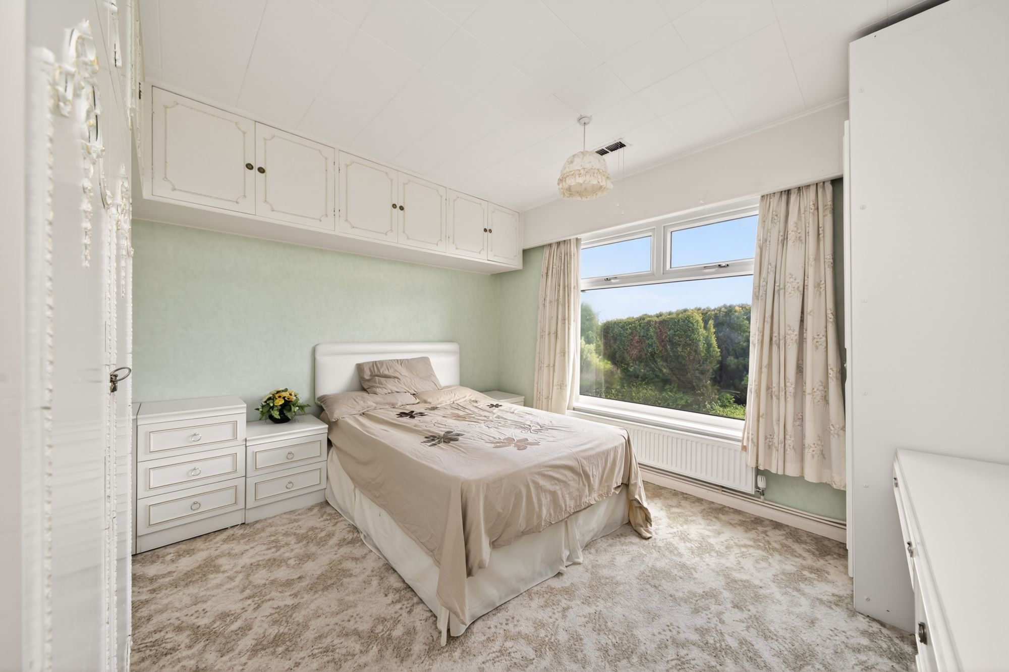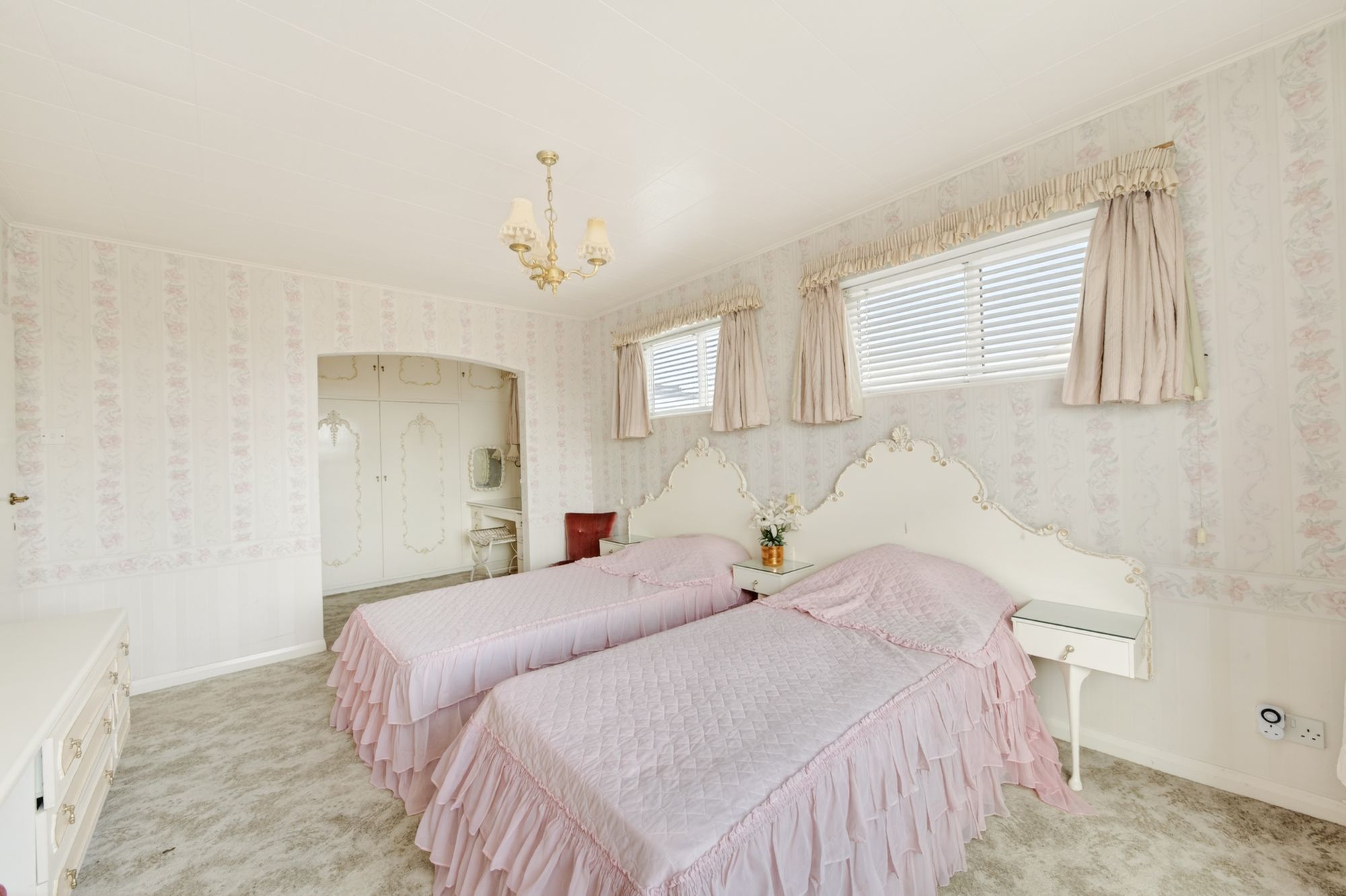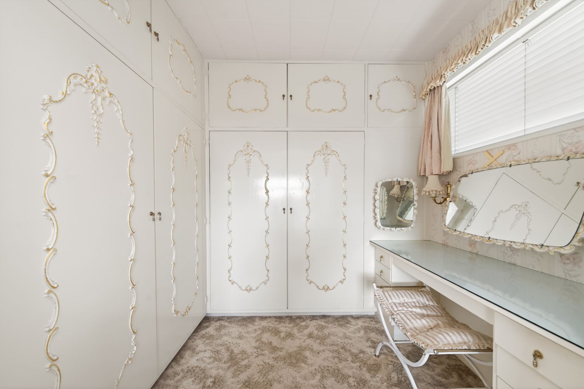 An arched double doorway leads into the dressing room which features floor-to-ceiling fitted furniture, including wardrobes with overhead cabinets and a fabulous dressing table with double-glazed window above.