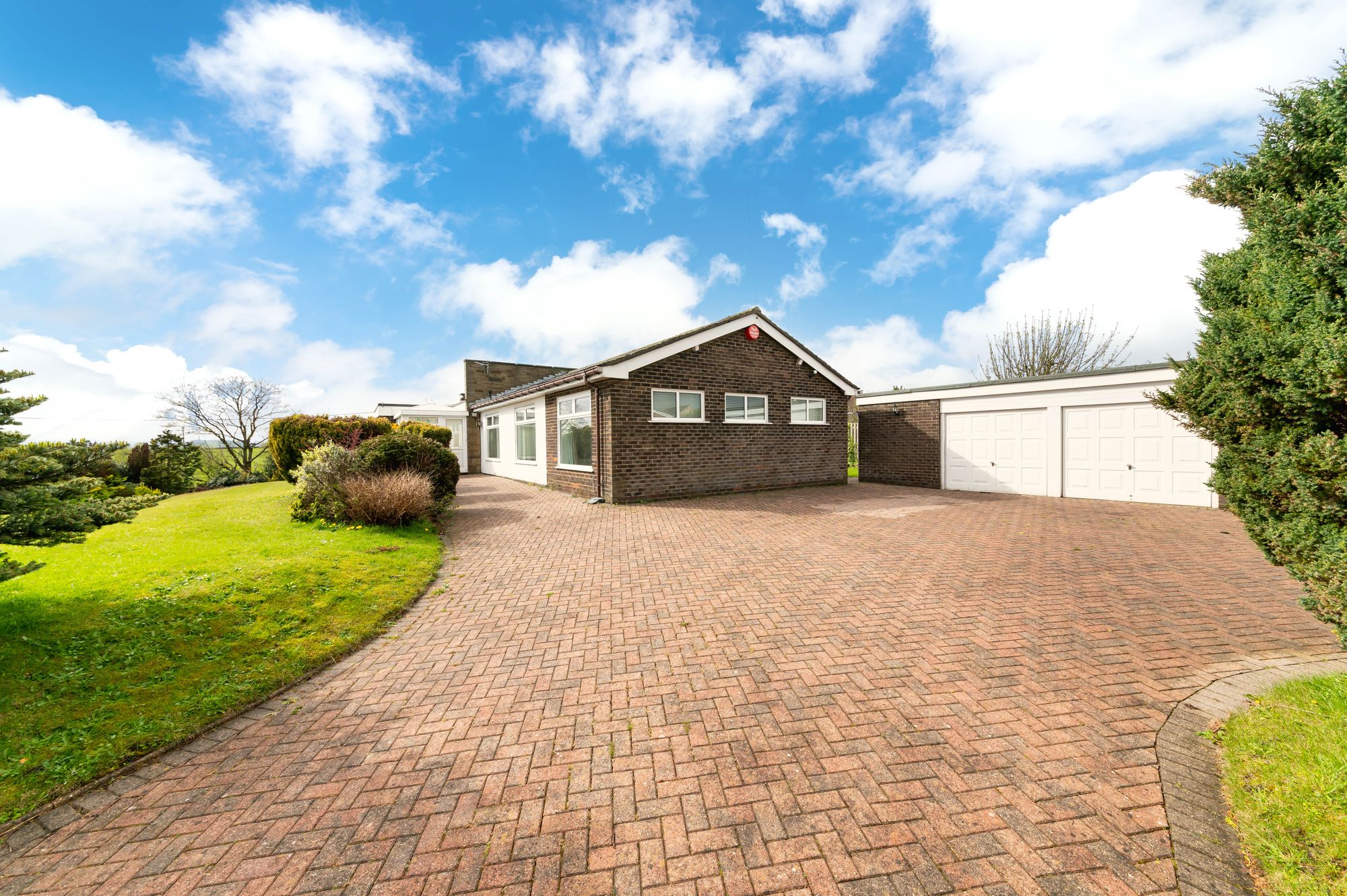The accommodation briefly comprises of utility room, kitchen, pantry, reception hall, open-plan living/dining room, sun room, conservatory, inner hallway, three/ four bedrooms, bathroom, shower room and separate WC. The principal bedroom has walk-in wardrobe/dressing room. Externally the property is approached through twin gates and features a spacious driveway with off street parking for multiple vehicles, which leads to a detached double garage with workshop, garden store and potting shed attached. The front lawn garden sweeps across the front of the property and round the side with a flagged patio ideal for alfresco dining and barbecuing.