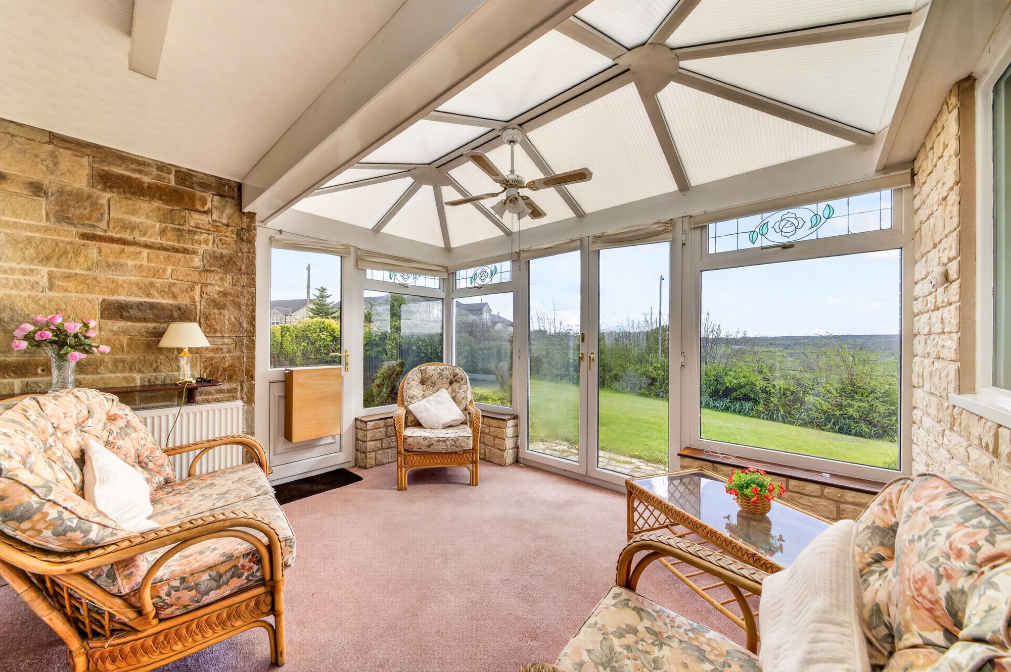 The conservatory enjoys a wealth of natural light courtesy of dual-aspect windows to the front and side elevations, which take advantage of fantastic views across the property's gardens and the valley beyond. There is a double-glazed external door to the side elevation and double-glazed French doors to the front elevation, as well as a fluorescent ceiling light point and a ceiling light with fan attachment, ample plug points, and a radiator.