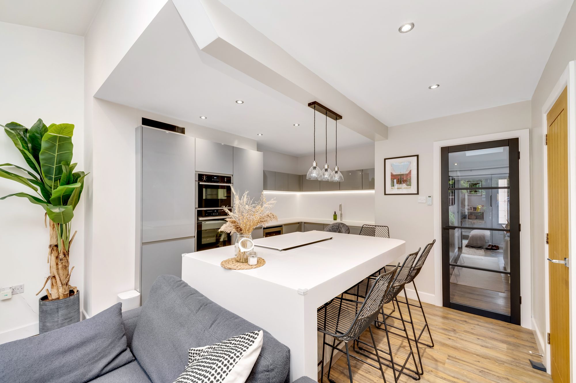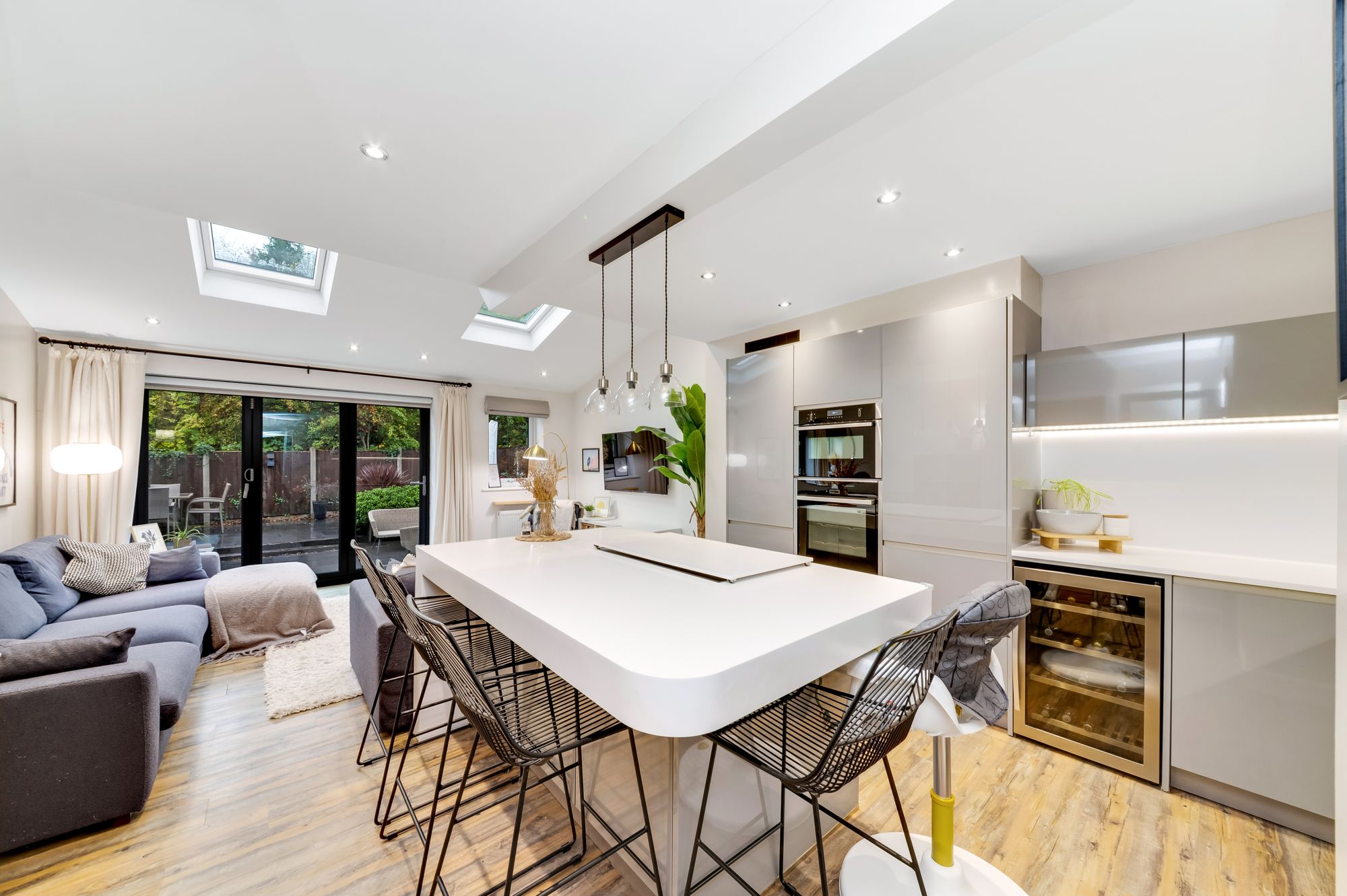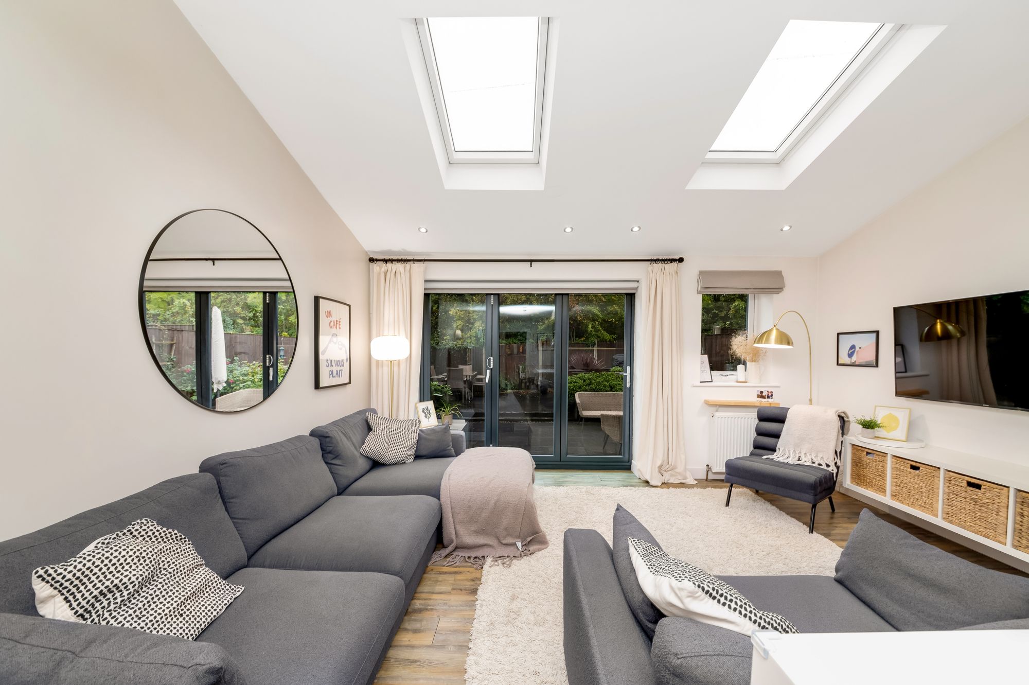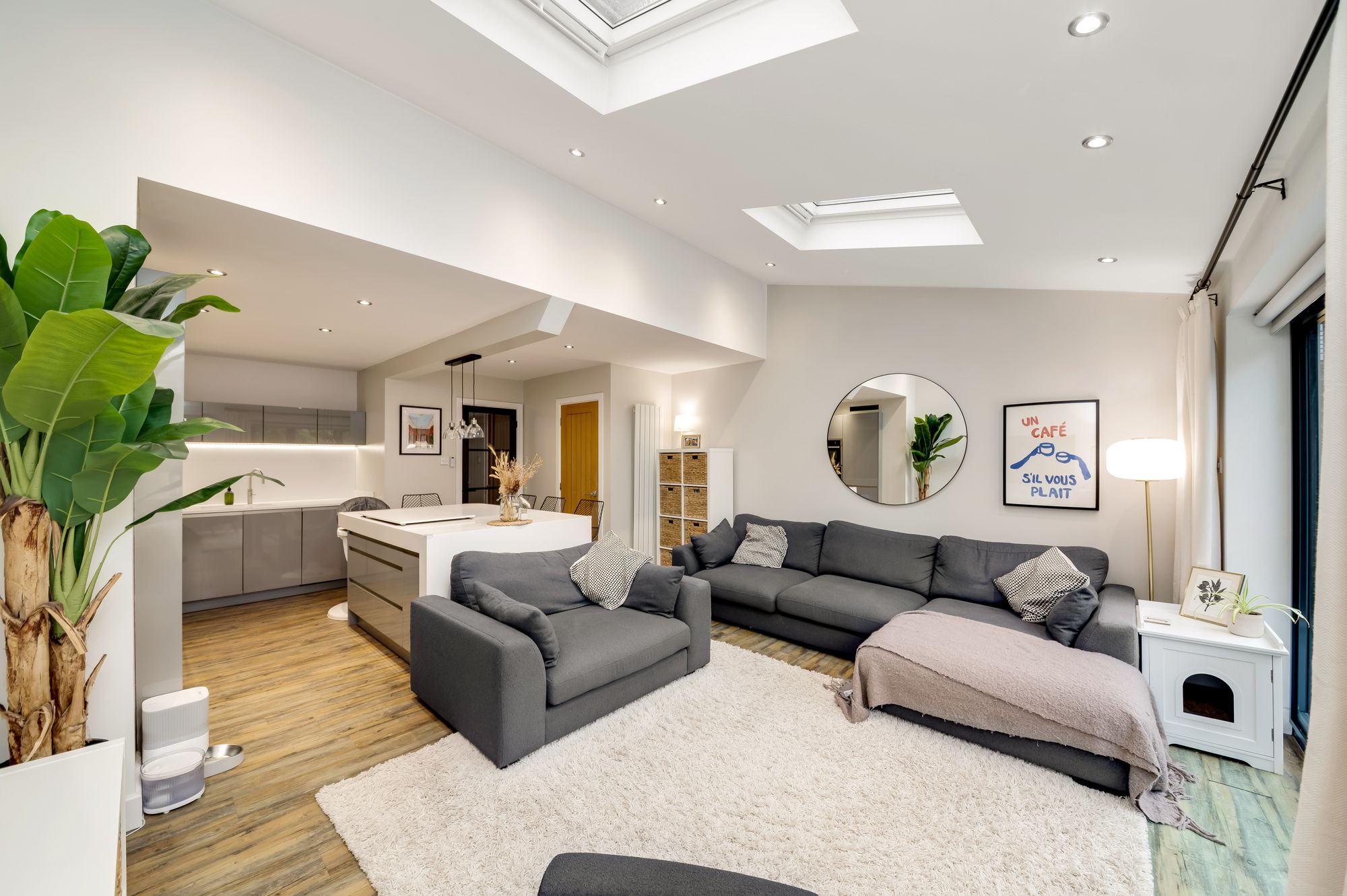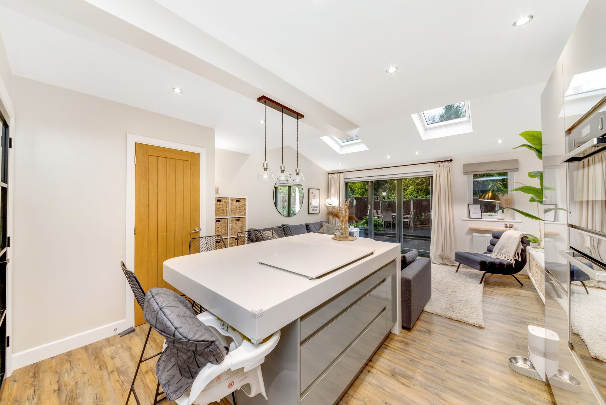 A similar stylish door leads to the living dining kitchen. This is perhaps best demonstrated by the combination of the photographs and the floor layout plan. It is a particularly large room and has a wonderful view out over the enclosed landscape garden, courtesy of a window but also a bank of three bi-folding doors which provide direct access out to the gardens. The room has been superbly fitted to an exceptionally high standard with the usage of lighting being particularly good. There is inset spotlighting, under unit lighting and a chandelier point above the island unit with Velux windows to the sloping roof to the garden side. The room has beautiful flooring, a stylish vertical central heating radiator along with other central heating radiators. There is provisions for a wall mounted TV, two good sized Velux windows and the kitchen units themselves are particularly stylish.
