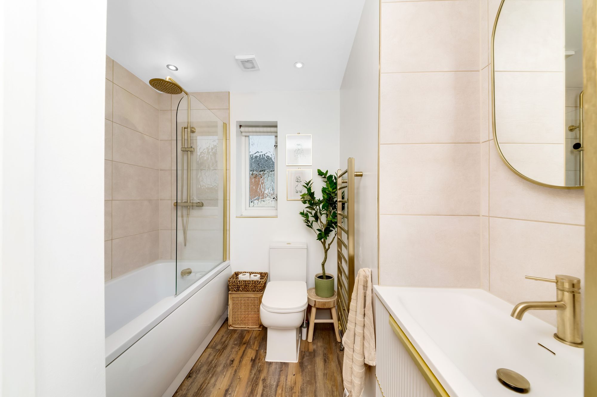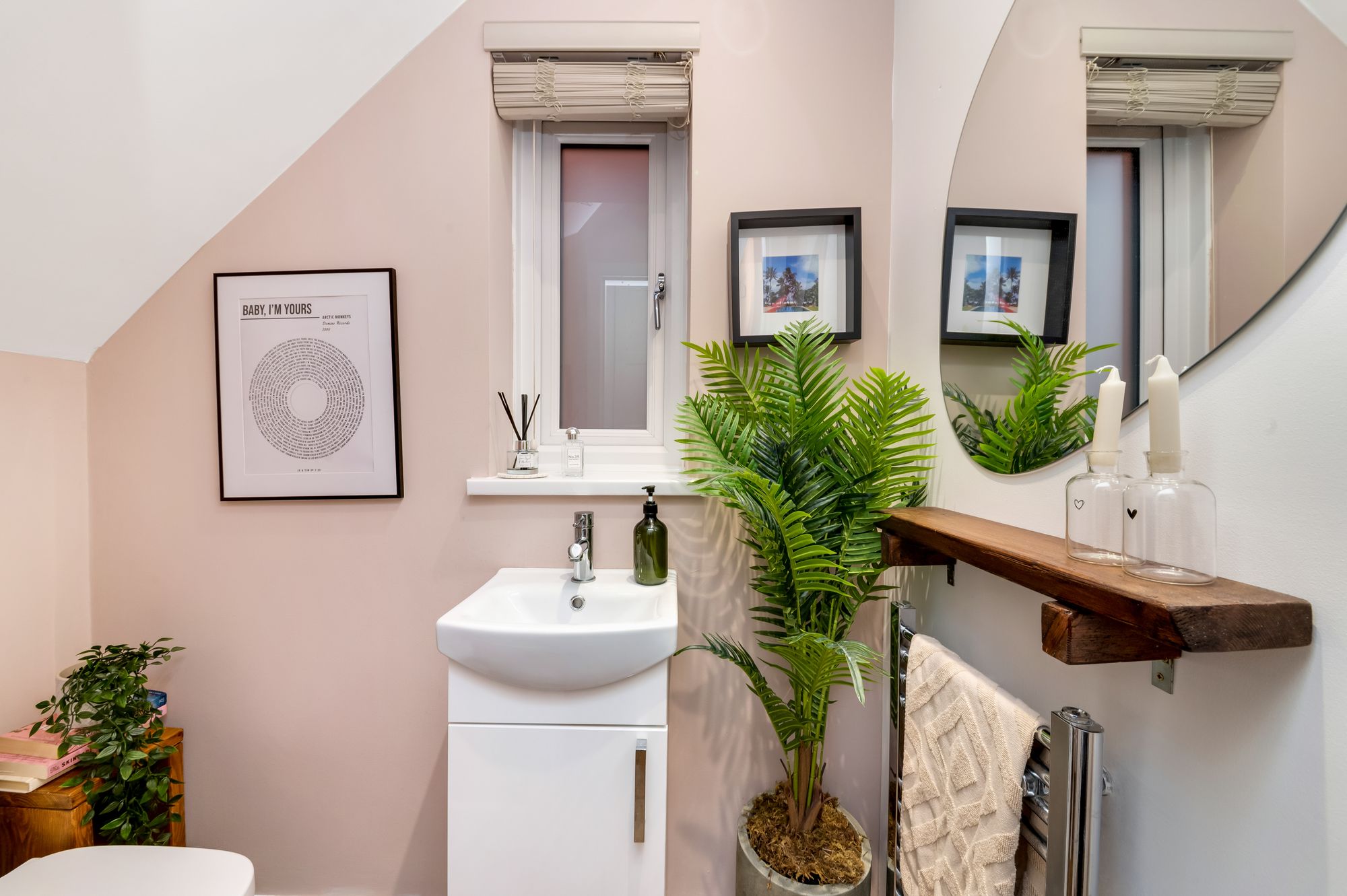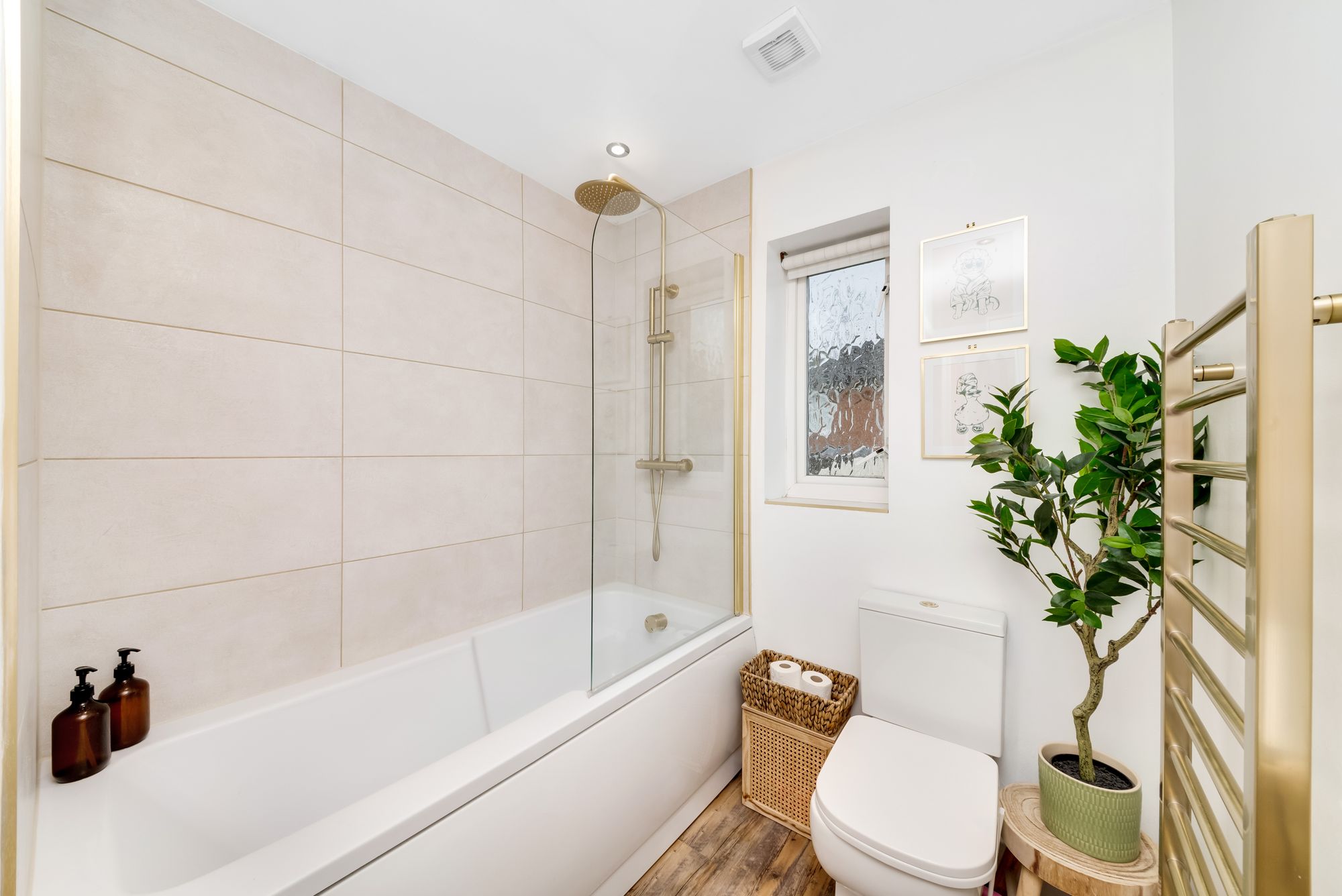 The property’s bathroom, as the photography suggests, is superbly presented and is particularly well laid out. There is a good height storage cupboard, a vanity unit with inset wash hand basin and good size drawers beneath with mirrored and tiled splash back. There is a low-level W.C., bath with glazed shower screen and an attractive shower fittings above. The bathroom also includes an obscured glazed window, an extractor fan, inset spotlighting and a very stylish chrome heated towel rail.
