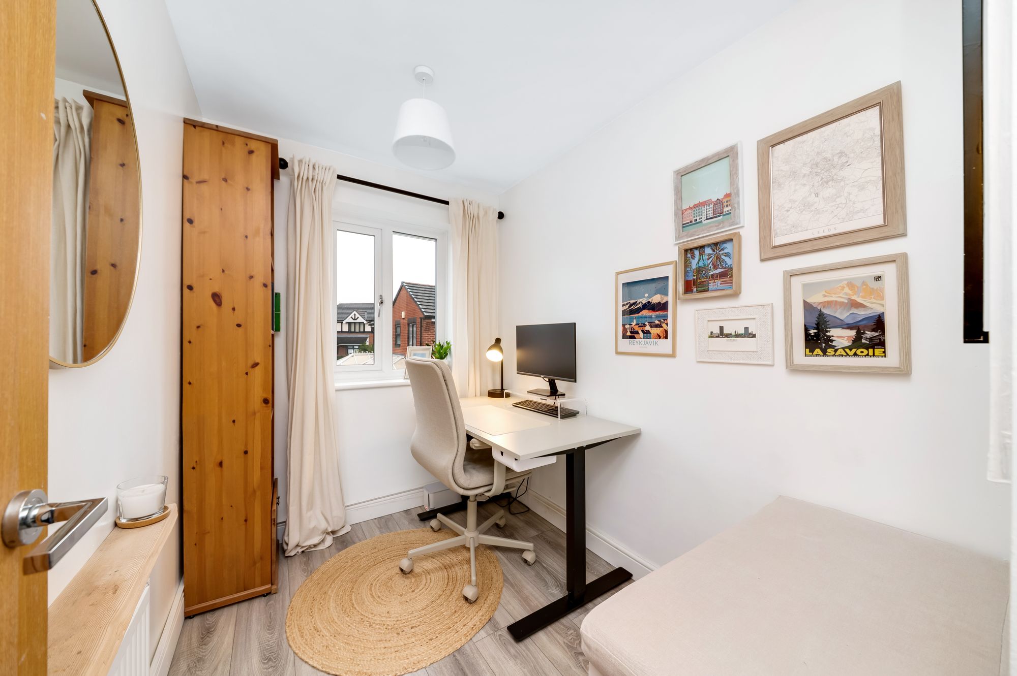 Bedroom four is a single room, this is currently used as a home office / study. A window gives outlook to the front, cushion plinth and high-level wardrobes stroke storage cupboards, attractive flooring and ceiling light point.