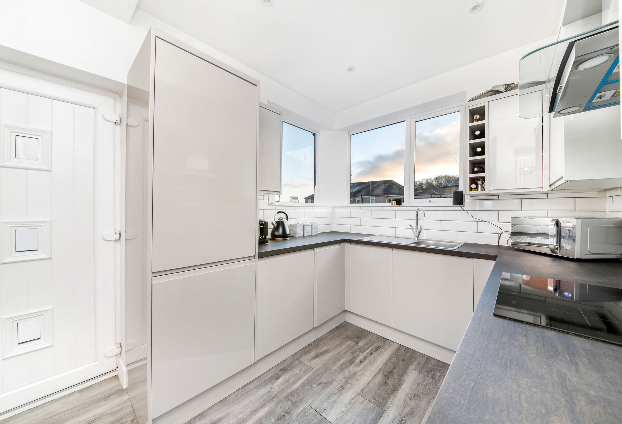 The kitchen features a wide range of high-quality fitted wall and base units with high-gloss, handleless cupboard fronts and complementary work surfaces over, which incorporate a single-bowl, stainless steel sink and drainer unit with chrome mixer tap. There are built-in appliances, including a four-ring Zanussi induction hob with canopy-style cooker hood over, a fan-assisted Beko oven, and an integrated fridge freezer unit. The kitchen benefits from soft-closing doors and drawers, dual-aspect windows providing a wealth of natural light and pleasant views, high-gloss, brick-effect tiling to splash areas, inset spotlighting to the ceiling, a cast-iron column radiator, a useful understairs pantry, an interconnecting door leading into the formal dining room, and a double-glazed, multi-panel door with obscure glazed inserts leading to a rear vestibule with doors then leading to the externally accessed utility room and garage.