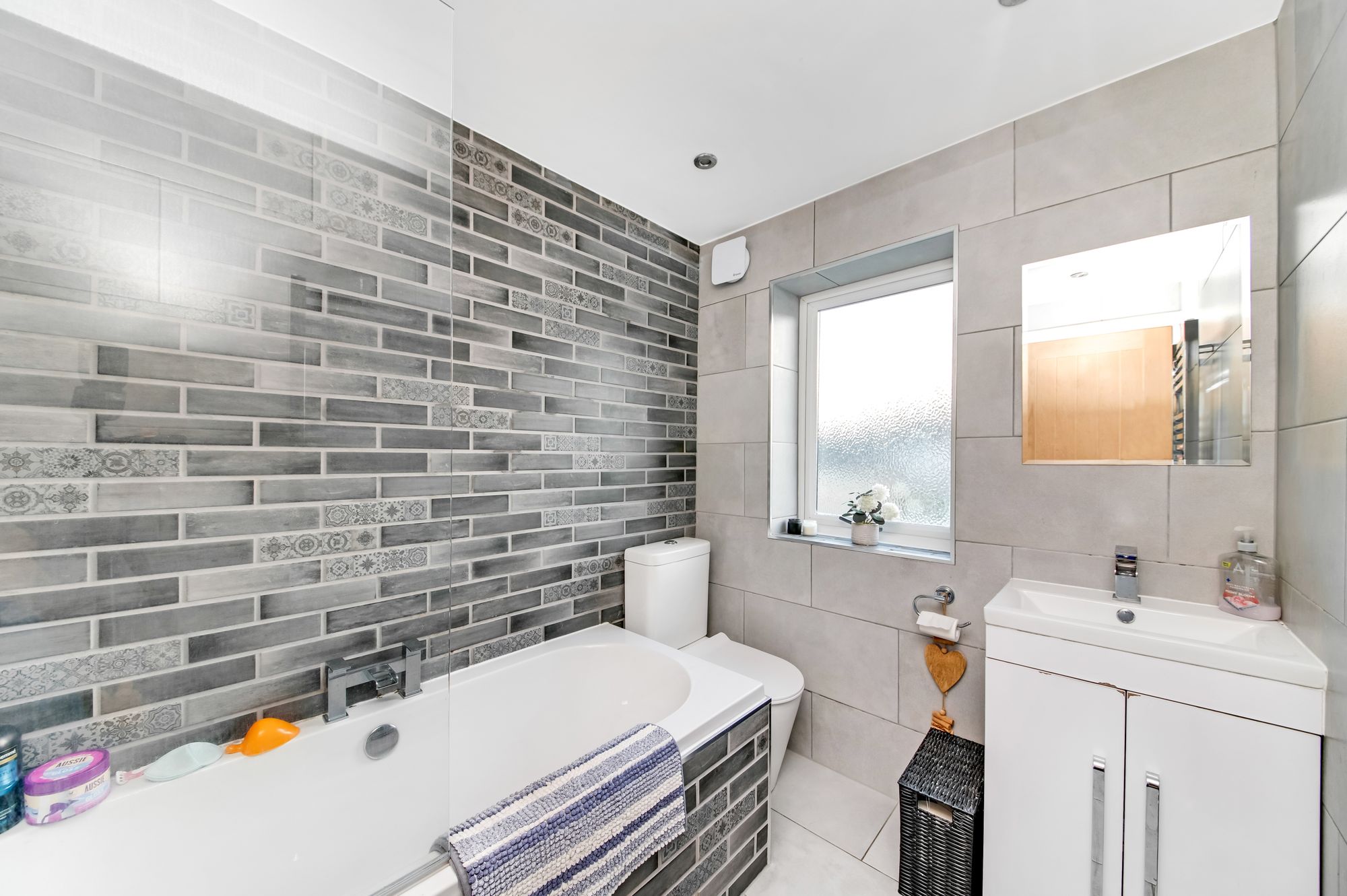 The house bathroom features a modern, three-piece suite comprising a double-ended, inset bath with tiled surround, cascading waterfall mixer tap and thermostatic shower over, a low-level WC with push-button flush, and a broad vanity wash hand basin with chrome cascading waterfall mixer tap and cupboards beneath. There is contrasting tiling to the walls, tiled flooring, inset spotlighting to the ceiling, a chrome ladder-style radiator, an extractor fan, and a double-glazed window with obscure glass and tiled surround to the rear elevation.