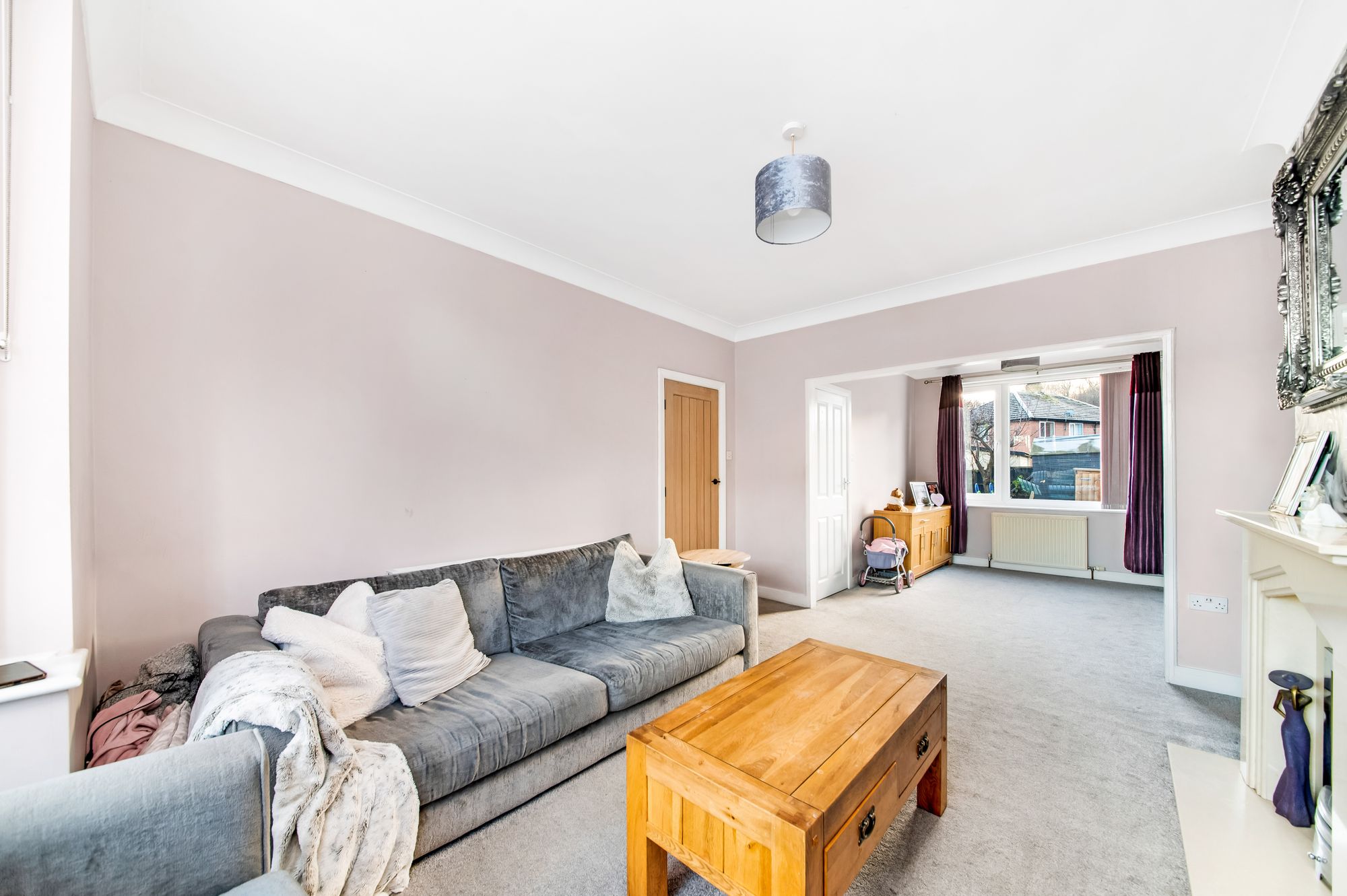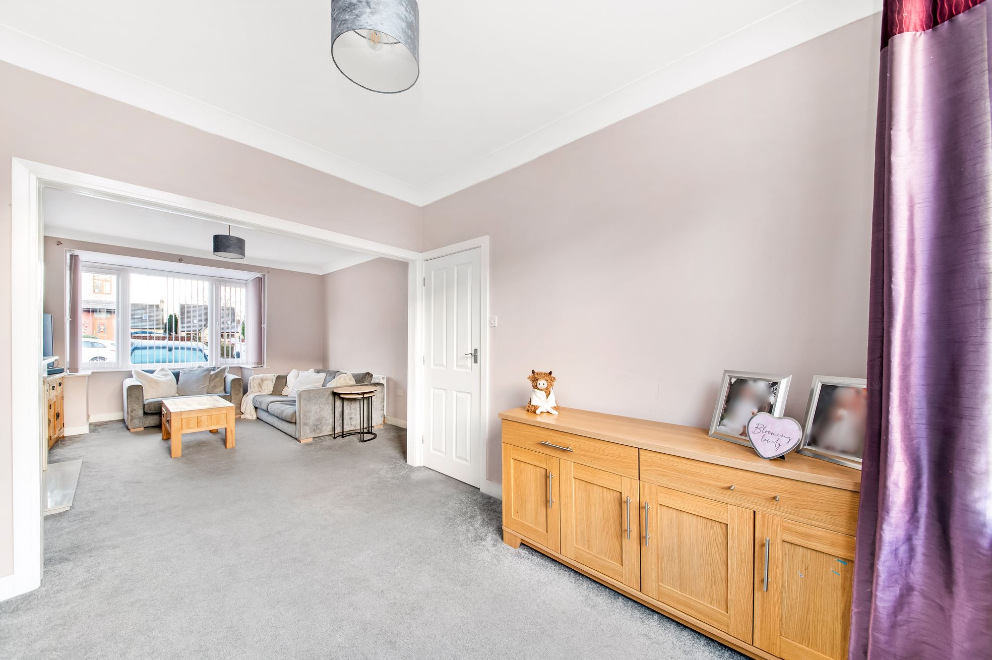 The living room enjoys a wealth of natural light cascading through a double-glazed bay window to the front elevation. There is decorative coving to the ceiling, a central ceiling light point, a radiator, and the focal point of the room is the living flame effect gas fireplace with ornate mantel surround set upon a raised hearth. A double doorway leads seamlessly into the formal dining area.