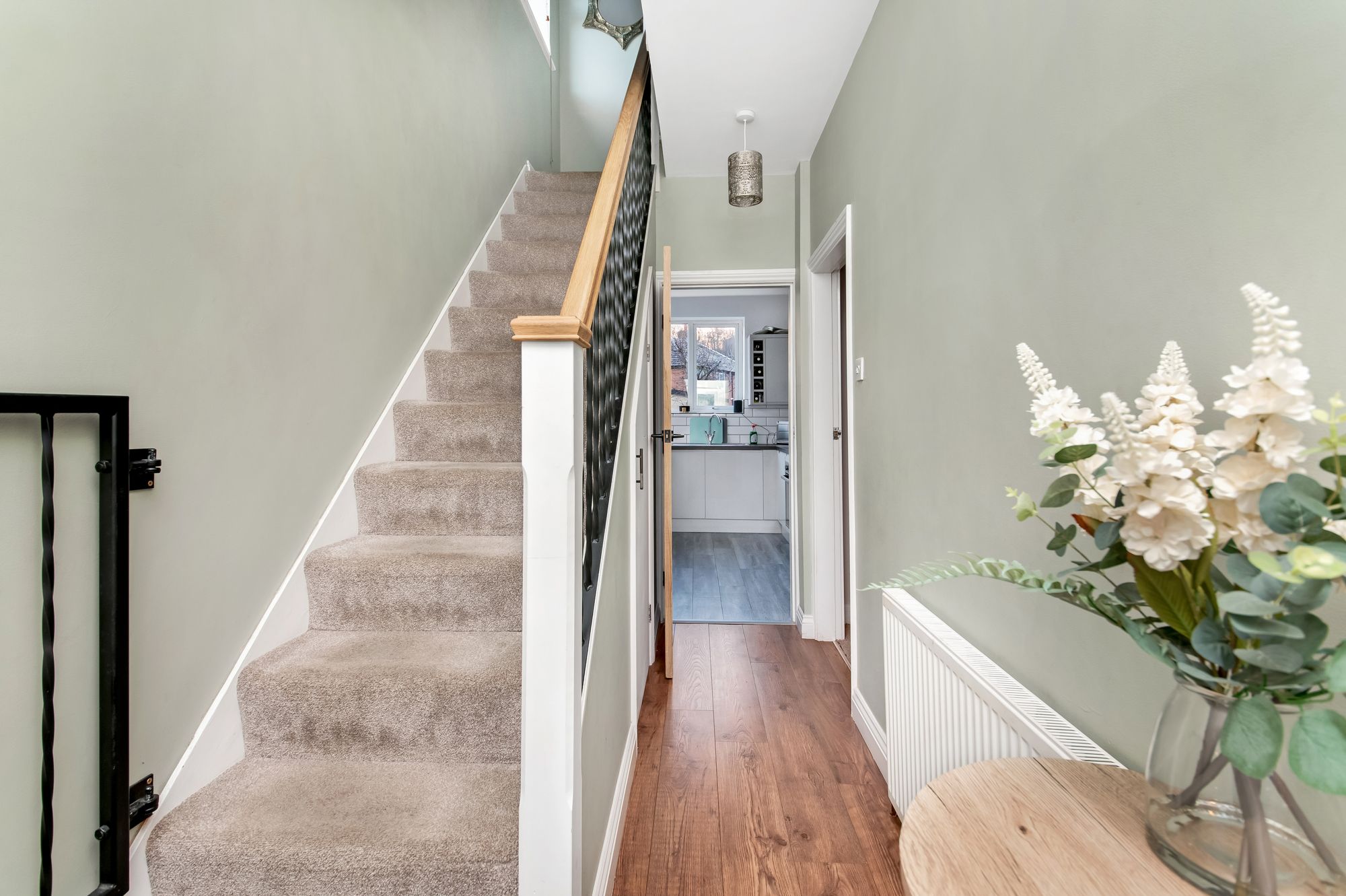 Enter into the property through a double-glazed, PVC front door with obscure glazed inserts and leaded detailing. The entrance hall features an adjoining double-glazed window with obscure glass to the front elevation, high-quality flooring, two ceiling light points, a radiator, and a carpeted staircase with oak handrail and twist spindle balustrade proceeding to the first floor. There is also a useful understairs storage cupboard and oak doors providing access to the kitchen and the open-plan living dining room.