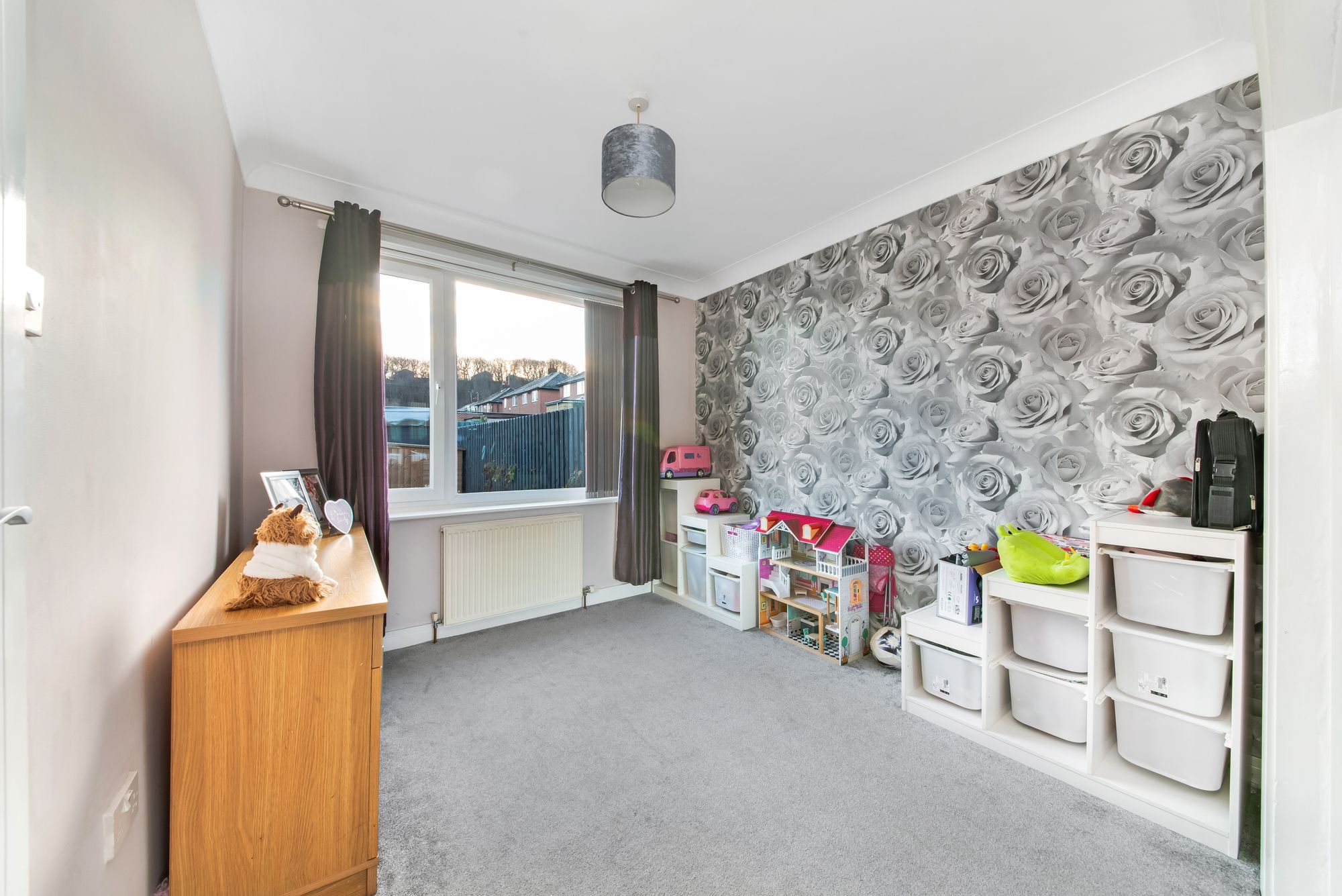 The formal dining area is currently utilised as a family room/play room. There is decorative coving to the ceiling, a central ceiling light point, a radiator, and a bank of double-glazed, three-quarter-depth windows to the rear elevation offering pleasant views onto the garden.