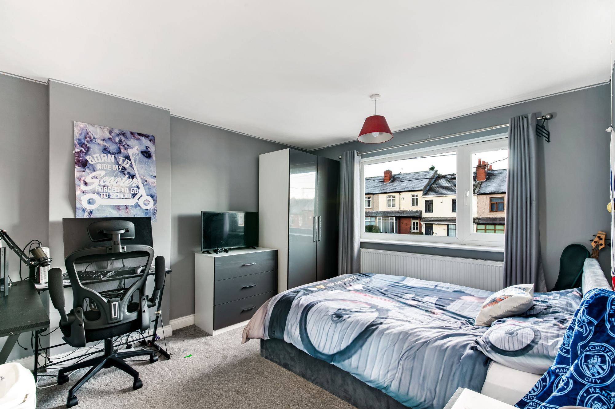 Bedroom three is situated to the front of the property and can accommodate a single bed with space for freestanding furniture. There is a useful fitted wardrobe with high-gloss doors built-in to the bulkhead for the stairs, a bank of double-glazed windows to the front elevation, a ceiling light point, and a radiator.
