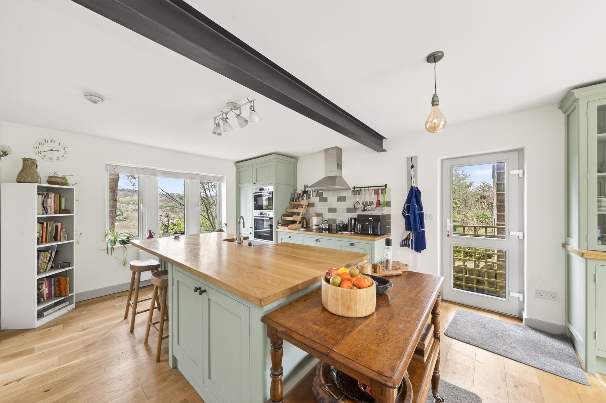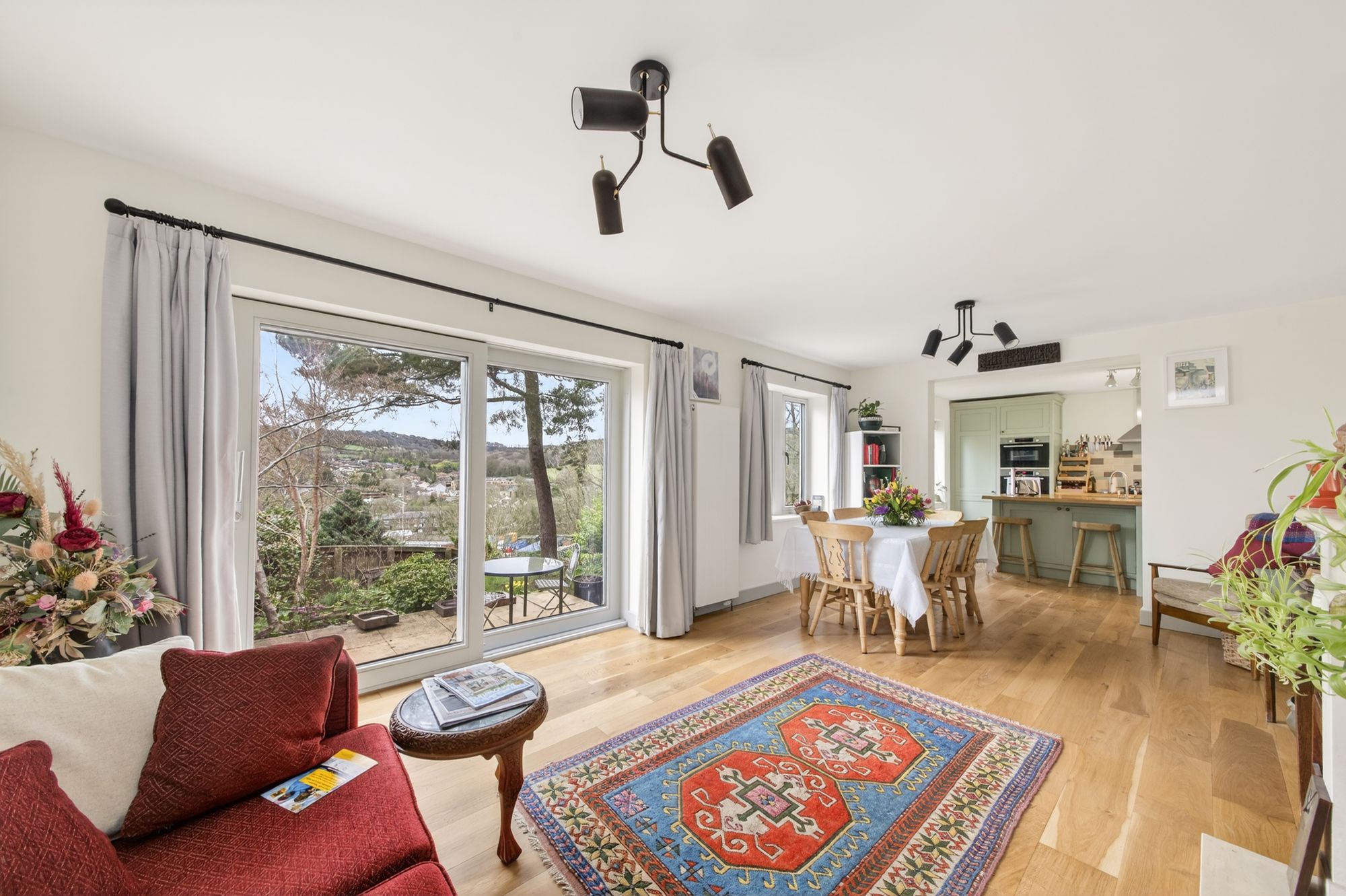 A fabulous hardwood flooring continues through from the inner hallway into the open plan dining, kitchen and family room as the photography suggests. The kitchen area enjoys a wealth of natural light which cascades through the dual aspect windows with a bank of triple glazed sliding patio doors to the front and a bank of triple glazed mullioned windows to the rear. The window to the rear elevation offers superb open aspect views across the valley and there is an exposed beam to the ceiling, three ceiling light points and three wall light points.