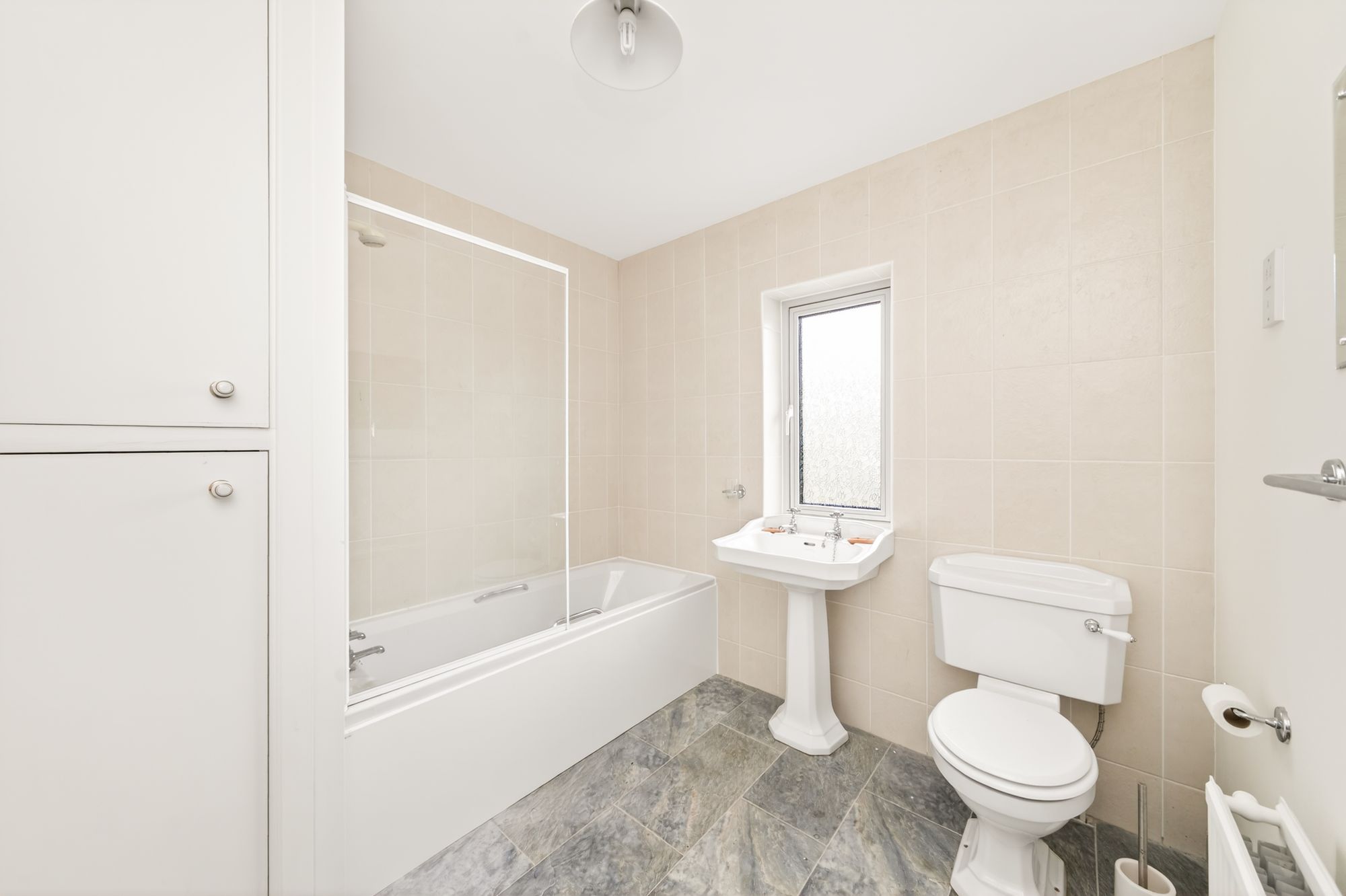 The house bathroom features a white three-piece suite, which comprises of a panel bath with electric Mira Sprint shower over and glazed shower guard, a traditional pedestal wash hand basin and a low-level w.c. There is attractive tiled flooring and tiling to the walls, a ceiling light point, radiator and a triple glazed window with obscure glass to the front elevation. Additionally, there is a cupboard providing a great deal of storage for toiletries and towels.