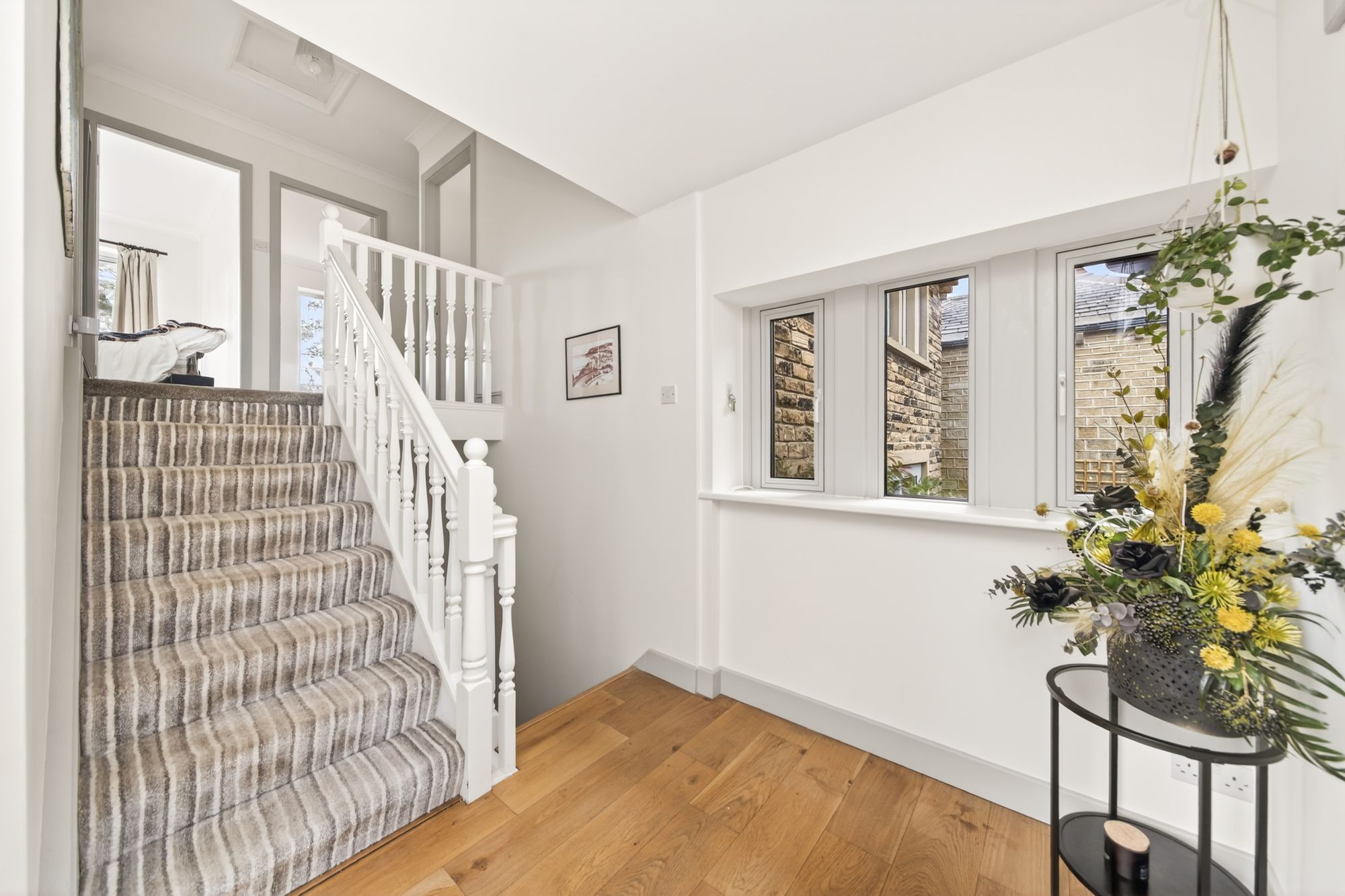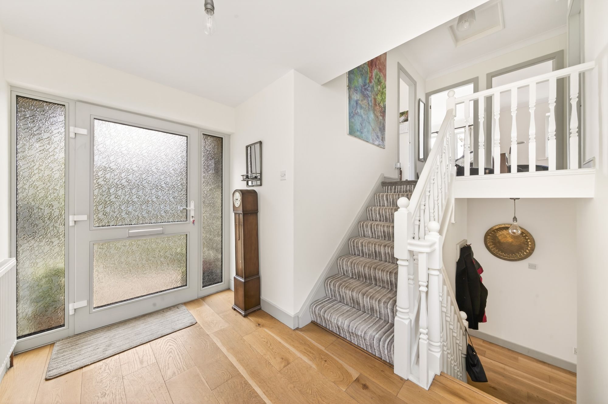Enter the property through a triple glazed door with adjoining triple glazed windows with obscure glass at either side from the side elevation into the entrance. The entrance features hardwood flooring, a ceiling light point, a bank of triple glazed mullioned windows to the side elevation provides a wealth of natural light. There is a door leading into the integral garage. A staircase rises to the first-floor accommodation and descends to the lower ground floor accommodation.