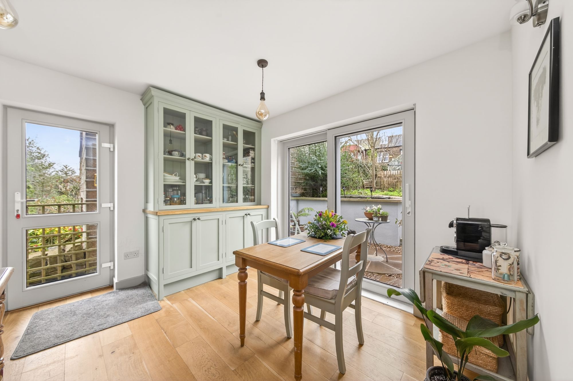 DINING, FAMILY ROOMThe dining / family room enjoys a great deal of natural light with a bank of triple glazed mullioned windows, as well as a bank of sliding patio doors with triple glazing, both in the rear elevation, giving pleasant views across the property's gardens and with far-reaching views across the valley. There is hardwood flooring, two ceiling light points, two wall light points and a vertical radiator. The focal point of the room is the electric fireplace which has a fabulous limestone surround, mantle and hearth.