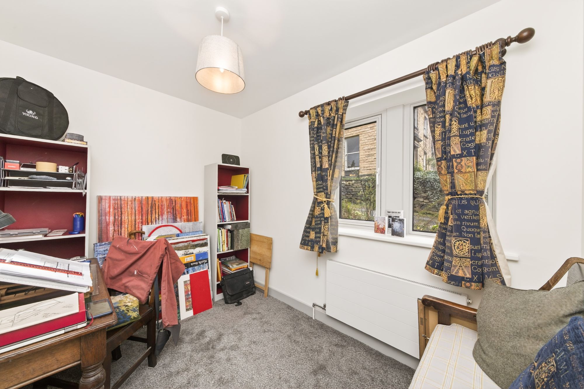 Bedroom three is currently utilised as a second study but can accommodate a single or double bed and benefits from an array of fitted furniture which includes fitted wardrobes with hanging rails and shelving, a drawer unit with cupboards above. There is decorative coving to the ceiling, a central ceiling light point, radiator and a bank of triple glazed, mullioned windows to the rear elevation with fantastic far-reaching views across the valley.