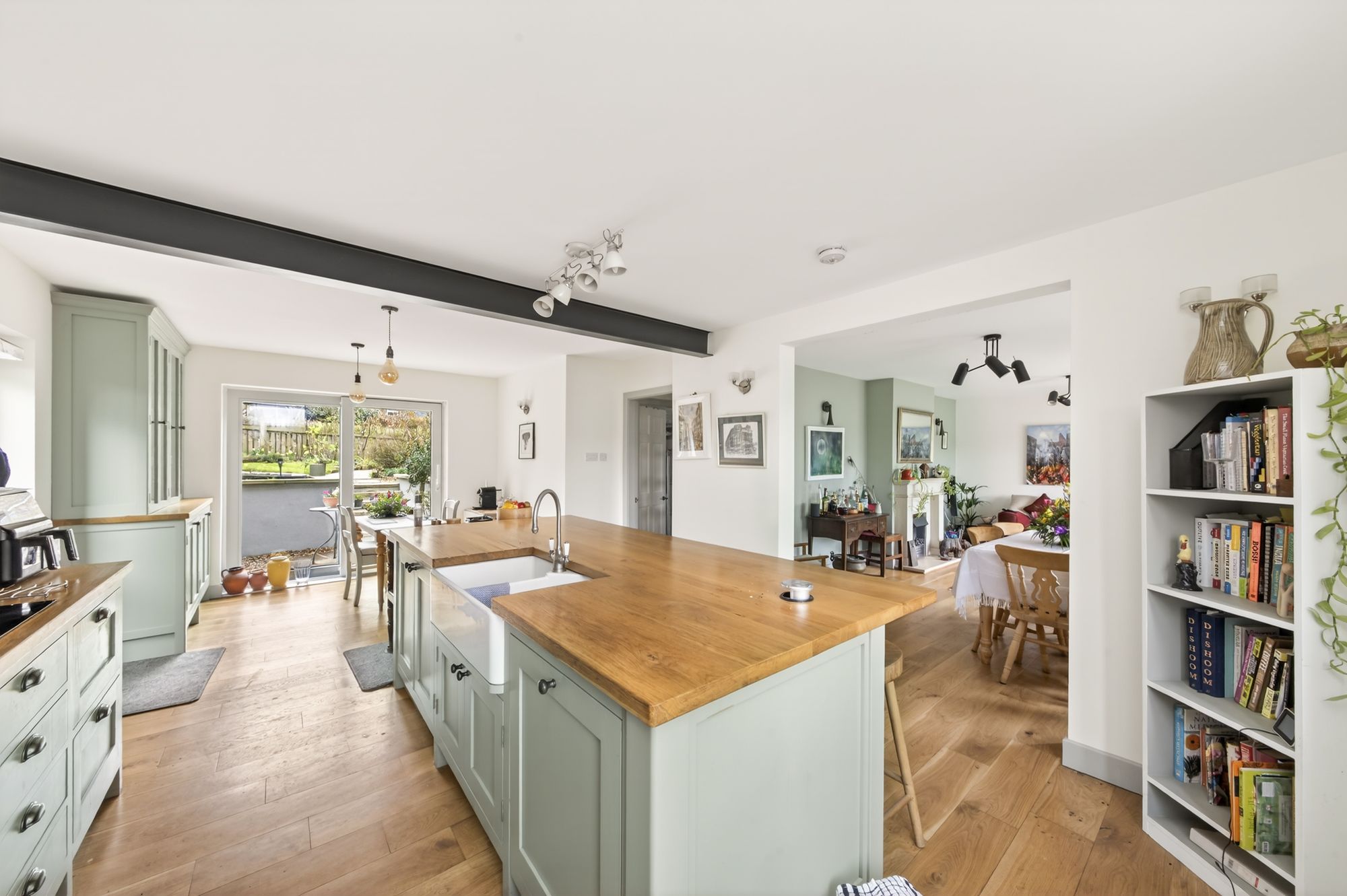 The kitchen features a wide range of fixed frame fitted wall and base units with shaker style cupboard fronts and with complimentary solid oak work surfaces over which incorporate a twin ceramic Belfast sink unit with brushed chrome mixer tap. The kitchen is equipped with built-in appliances which includes a four-ring Bosch ceramic induction hob with canopy style cooker over, a built-in waist level oven, integrated shoulder level microwave combination oven, built-in fridge and freezer unit and a integral dishwasher. There is attractive tiling to the splash areas, a radiator and a bespoke fitted unit with glazed display doors. The focal point of the kitchen area is the beautiful breakfast island again with solid wood tops and with ample cupboards, a wealth of storage, providing a great space for food preparation and informal dining. The kitchen area then seamlessly leads into the dining / family room.