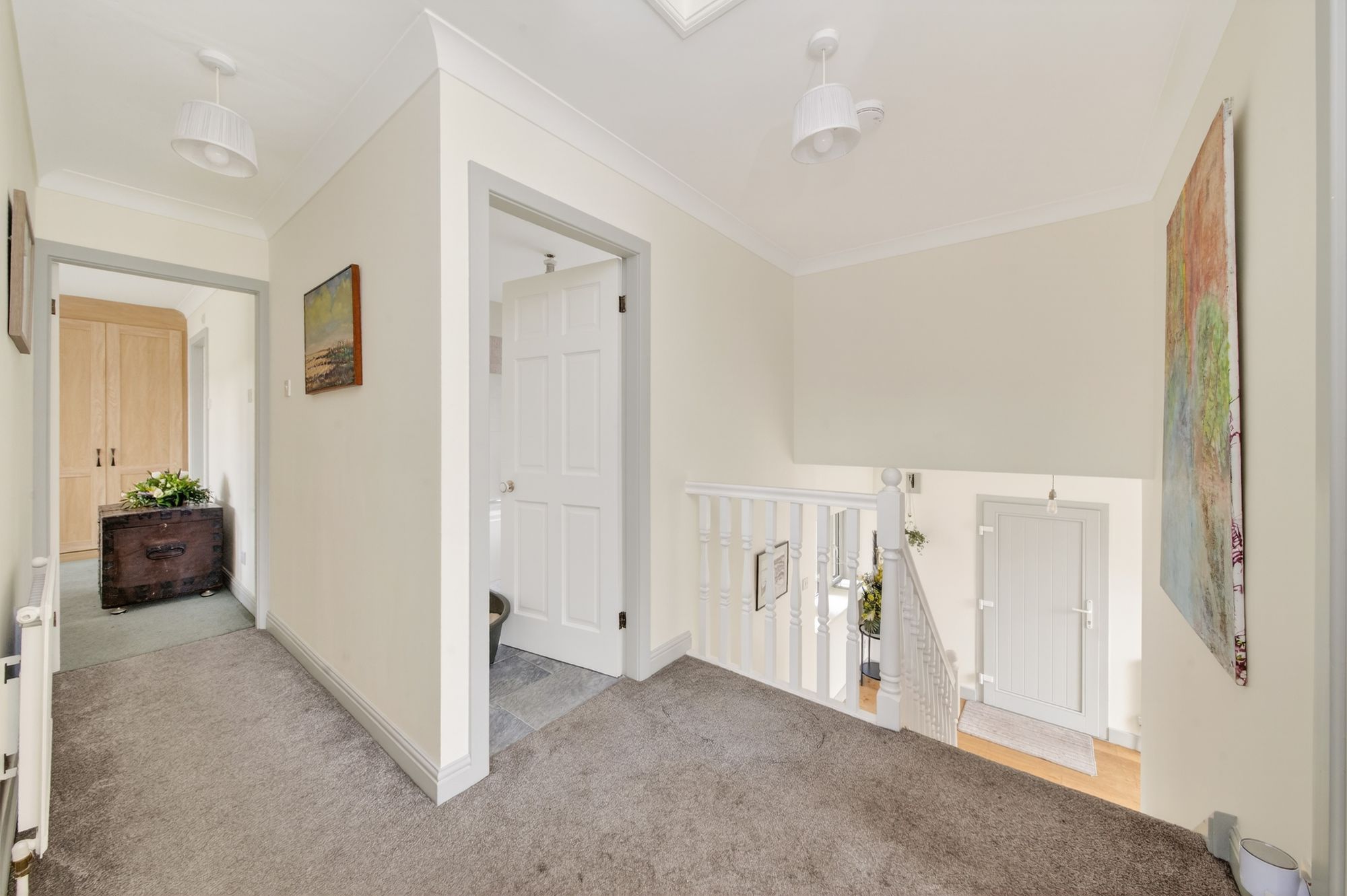 LANDINGTaking the staircase from the entrance, you reach the first-floor landing, which has multi-panel doors providing access to the bedroom and bathroom accommodation. There is decorative coving to the ceiling, two ceiling light points, a radiator and a wooden banister with spindle balustrade over the stairwell head. Additionally, a loft hatch provides access to a useful attic space.