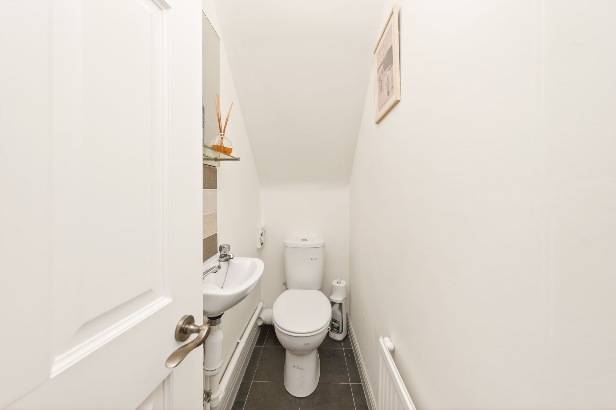 DOWNSTAIRS W.C.The downstairs w.c. features a white two-piece suite, which comprises of a low-level w.c. with push-button flush, a wall hung wash hand basin with towel splash back. There is an extractor fan, ceiling light point and radiator, and tiled flooring.