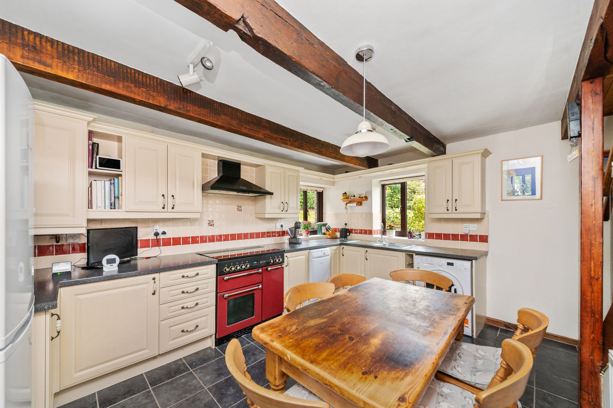 Bedroom three can accommodate a double bed with ample space for freestanding furniture. There is a bank of double-glazed windows to the rear elevation offering pleasant views onto the rear garden and of the tree-lined outlook. There are exposed timber beams and trusses, a ceiling light point, a radiator, panelled walls, and bespoke fitted cupboards providing additional storage.