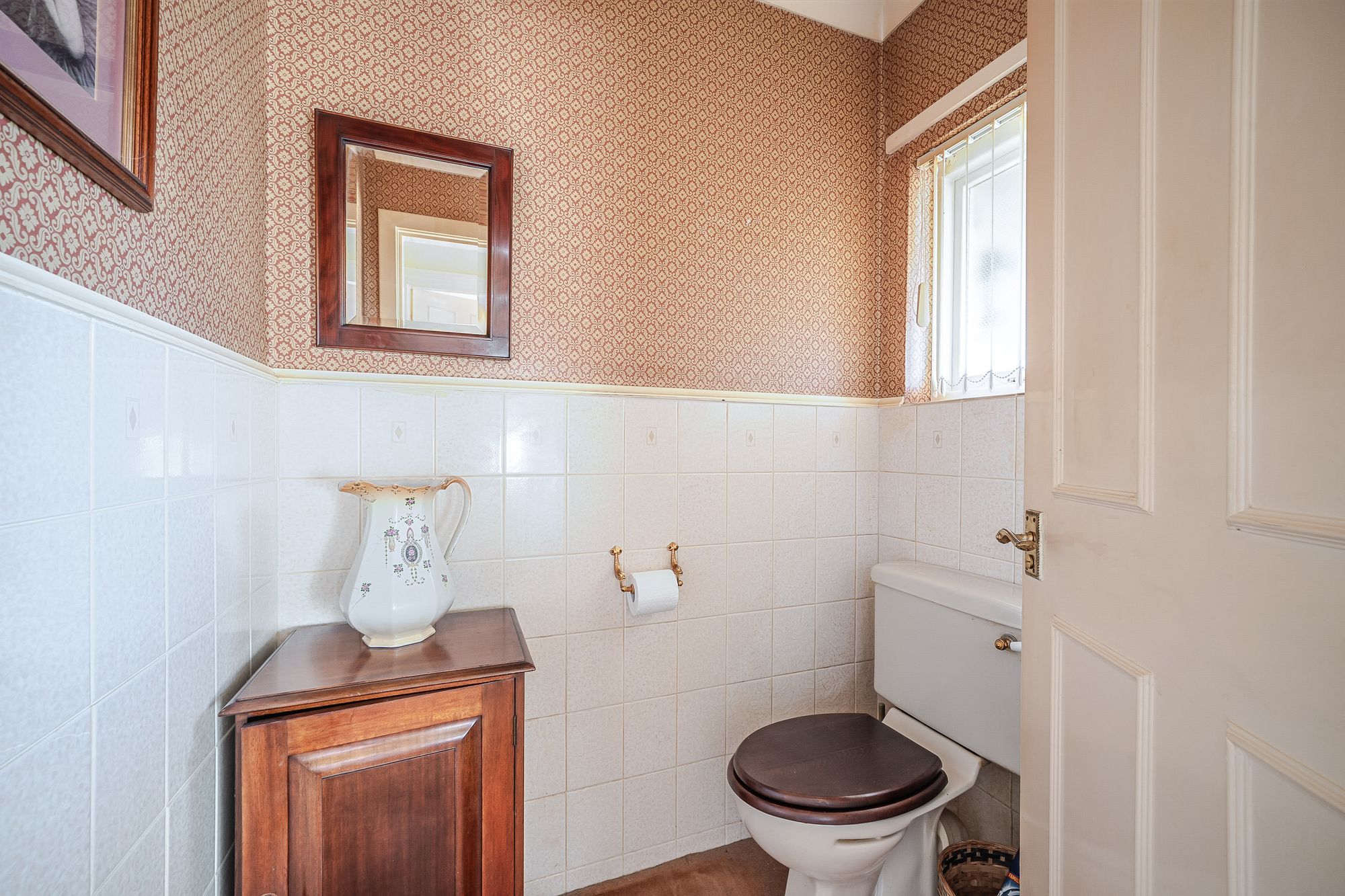 With a timber and frosted glazed window, inset ceiling downlighters, ceiling coving, tiled walls to dado height and fitted with a suite comprising pedestal wash basin and low flush WC.