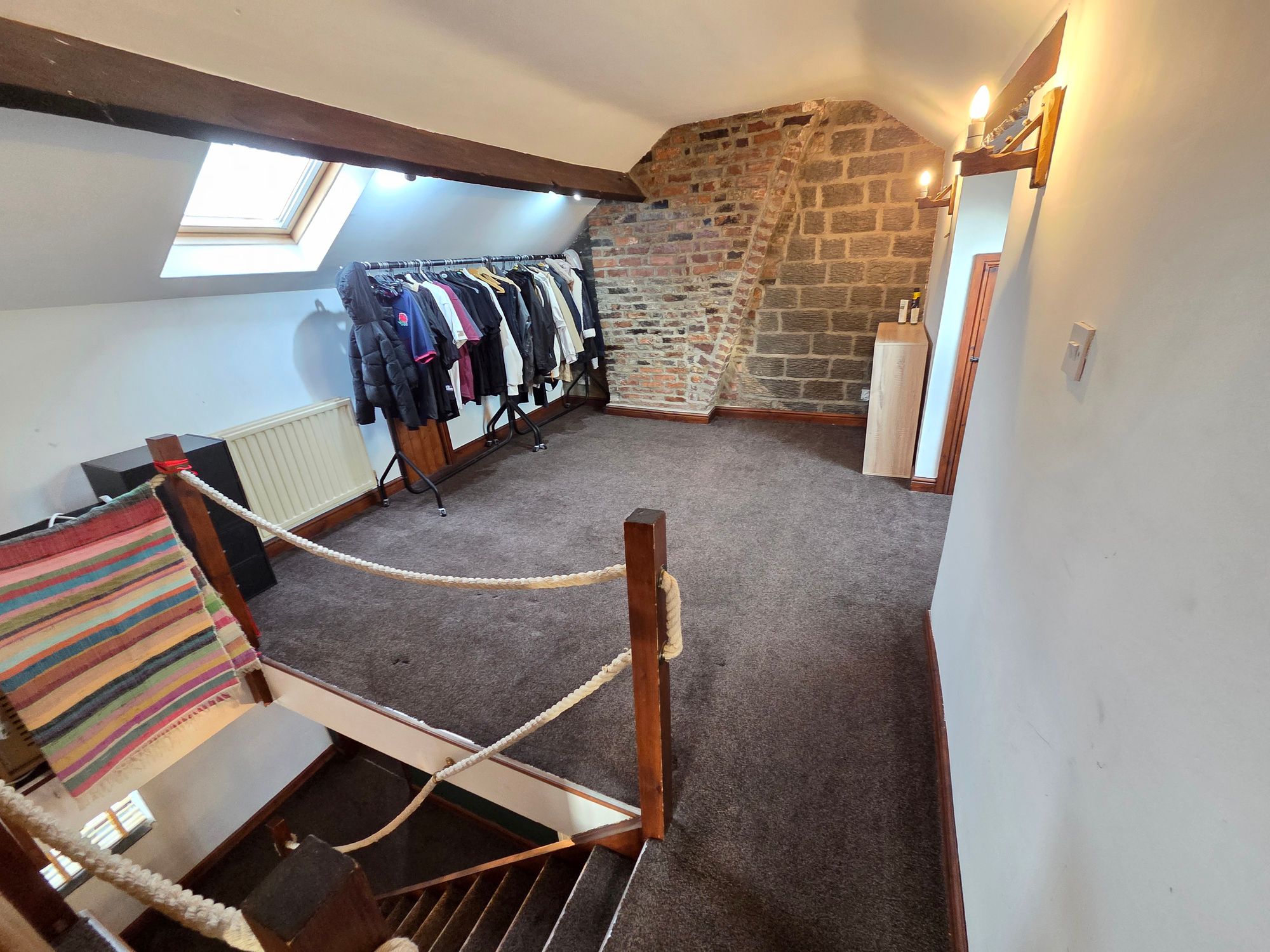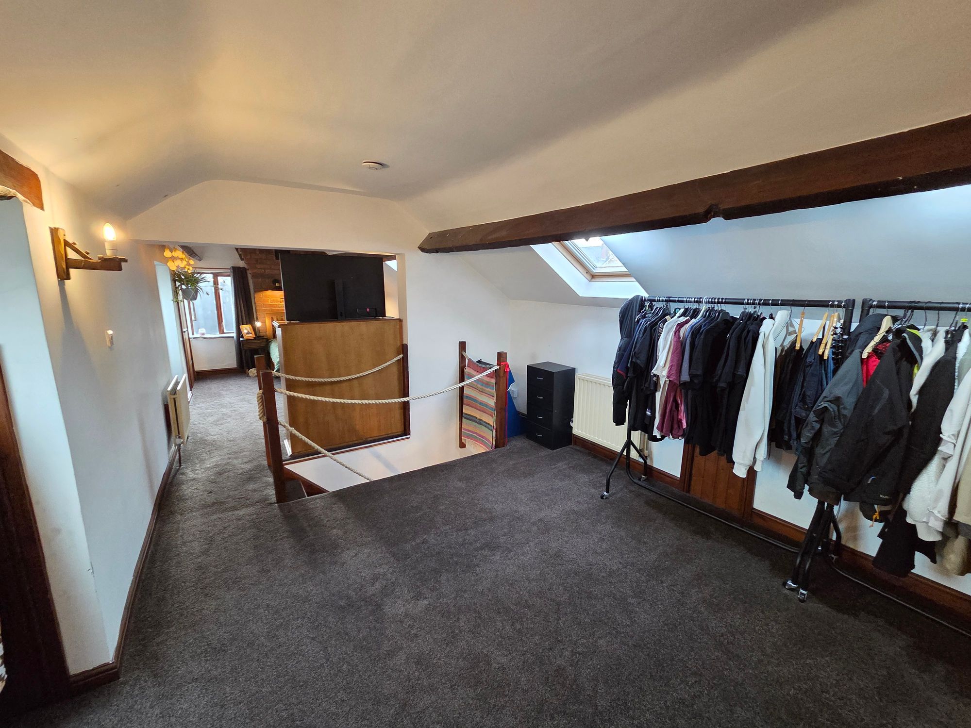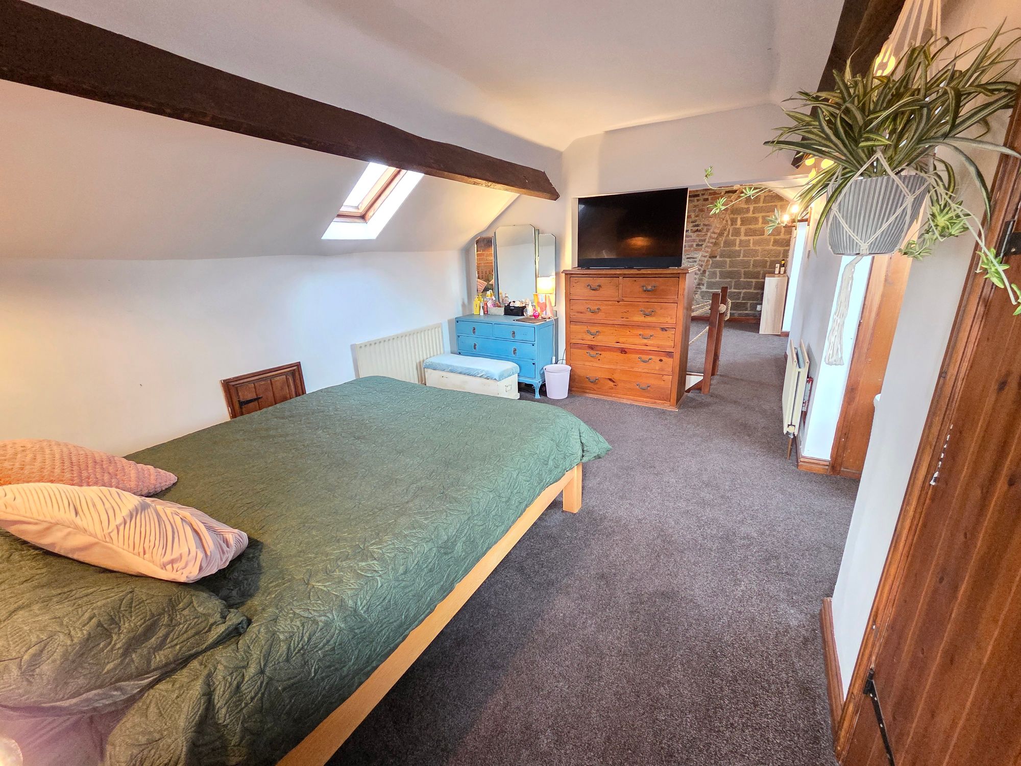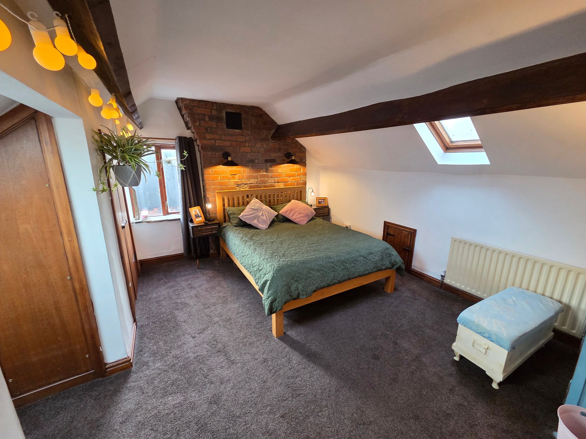 ATTIC ROOMIdeal as an additional living space and currently used as a bedroom and dressing area. The room has four wall mounted lights, two beam mounted spotlights, four Velux skylights, multiple storage cupboards, access to eaves storage, four central heating radiators and wooden double-glazed window.