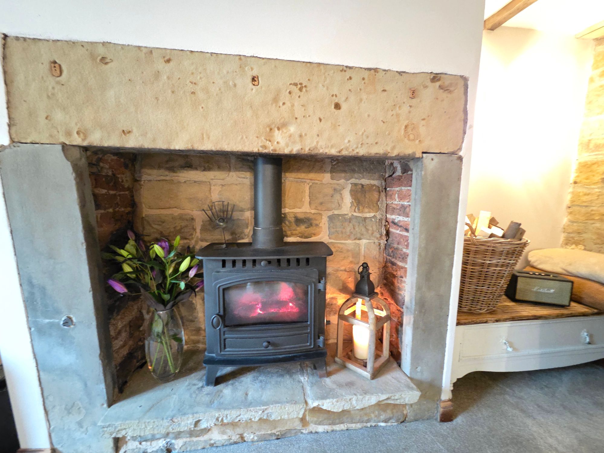 LIVING ROOMA spacious room with exposed beams to the ceiling, original stone feature wall, four wall mounted lights, wooden double-glazed windows overlooking the front of the property. The main focal point of the room is the original chimney breast with a multi-fuel stove inset.