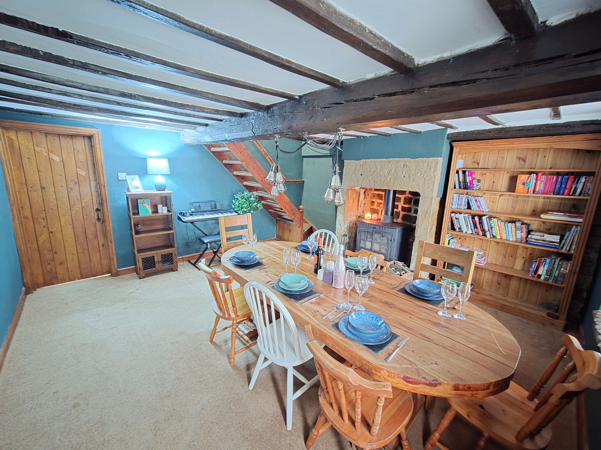 DINING ROOMA spacious dining room with ample room for dining furniture. The room has two ceiling lights, exposed beams, central heating radiator, staircase rising to first floor, wooden double-glazed window and the main focal point of the room being a multi-fuel burning stove sat in the original chimney breast.