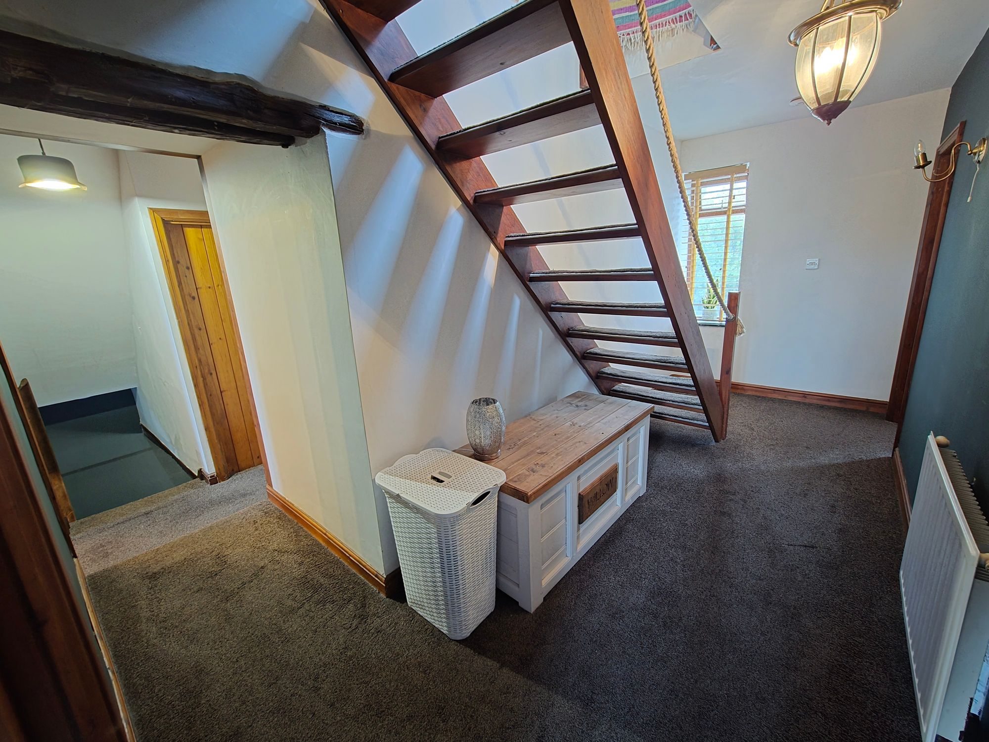 FIRST FLOOR LANDINGFrom the dining room a staircase rises to the first-floor landing with two ceiling lights, two wall mounted lights, central heating radiator, wooden double glazed window, staircase rising to attic room and access to the following rooms.