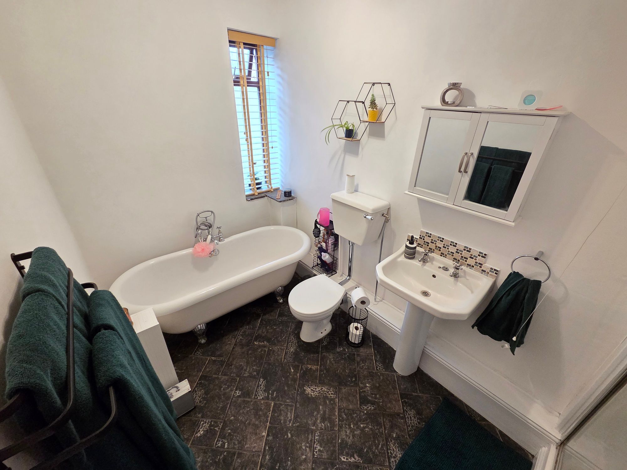 BATHROOMComprising of a four-piece suite in the form of; high flush W.C, pedestal basin with chrome taps over with tiled splashback, shower enclosure with Triton electric shower within and free-standing roll top bath with chrome mixer tap over and shower attachment. The room has a ceiling light, inset ceiling spotlights, tiled floor, central heating radiator and obscure uPVC double glazed window.