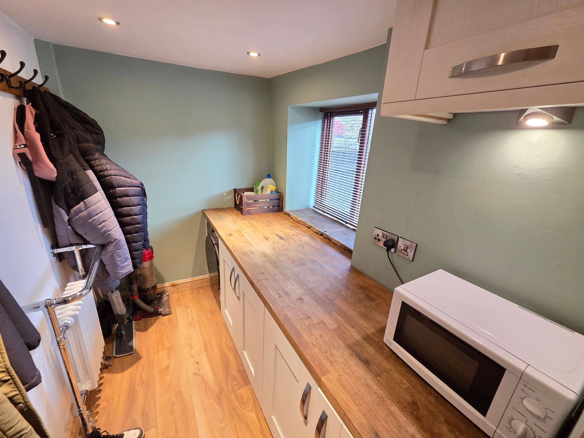 UTILITY ROOMAccessed from the rear entrance hall, the utility comprises of a selection of base units, with wooden worktop over, plumbing for a free-standing washing machine, insert ceiling spotlights, Victorian style central heating radiator with towel warmer and wooden double-glazed windows to the rear of the property.