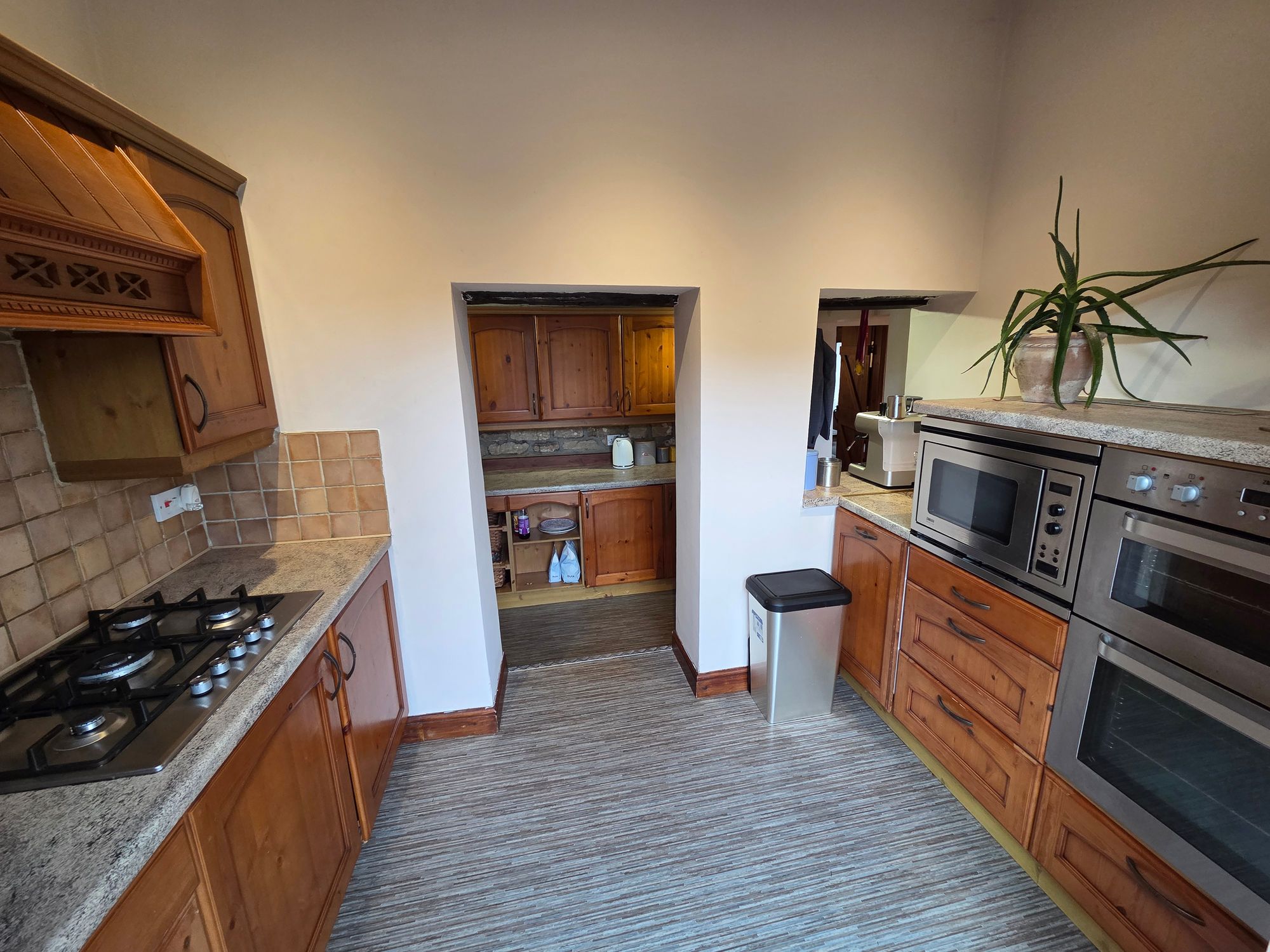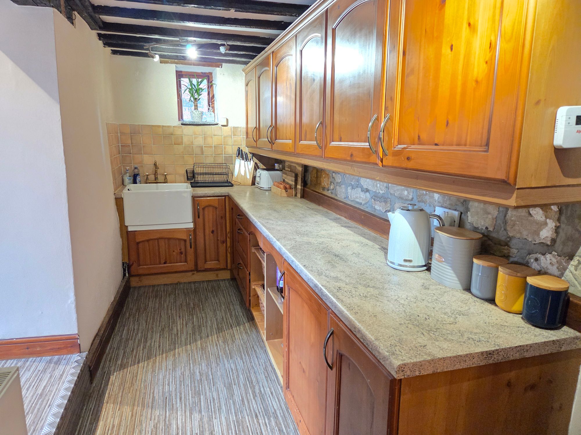 KITCHENSplit over two levels, the upper section of the kitchen itself has a range of wall and base units in a oak shaker style with laminate worktops over and tiled splashbacks. Integrated appliances in the form of; integrated Zanussi microwave, integrated Zanussi double oven with five ring burner gas hob and extractor fan over. There is a ceiling light, central heating radiator and uPVC double glazed French style doors leading to the rear of the property. To the lower section of the property is further wall and base units in an oak shaker style with laminate worktops overs and tiled splash backs and Belfast style sink with brass mixer tap over. The room has two ceiling lights, inset ceiling spotlights, exposed beams and wooden window to the side of the property.