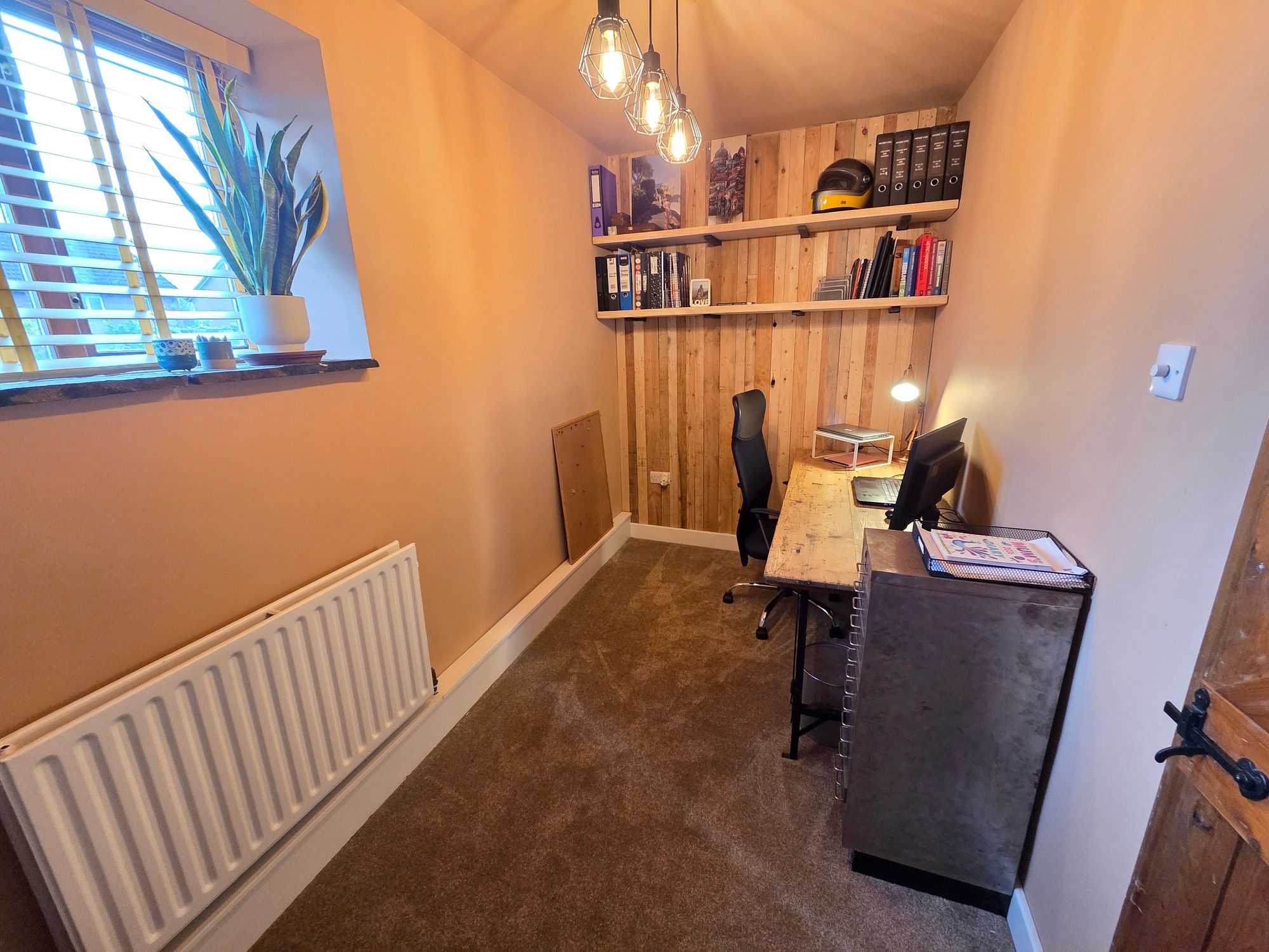 BEDROOM THREECurrently used as an office, a further spacious bedroom with ceiling light, wood panelling, central heating radiator and wooden double-glazed window to the rear.