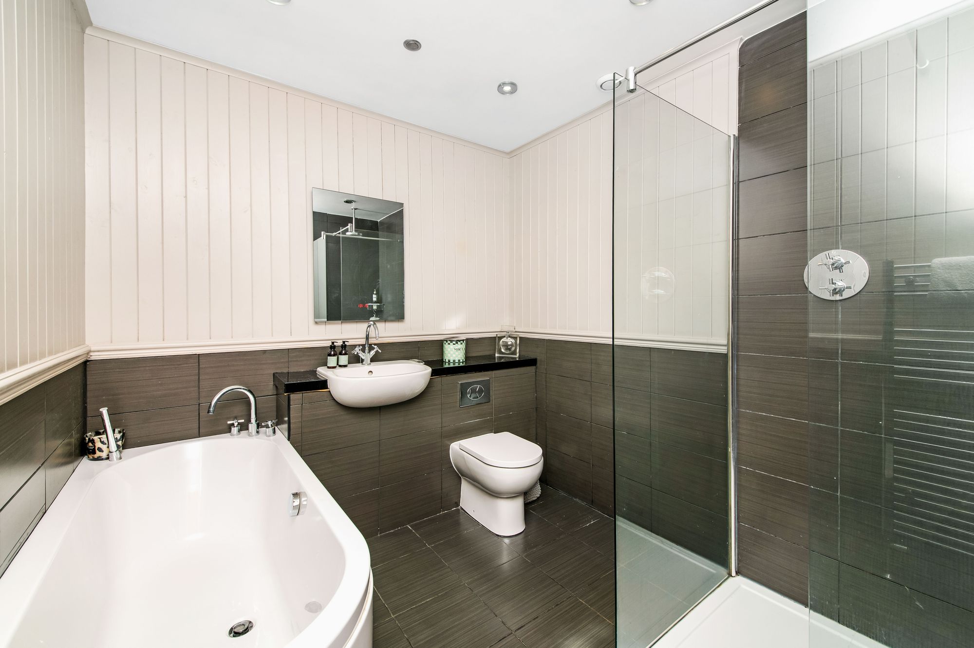 The house bathroom features a modern contemporary four-piece suite which comprises of a panel bath with handheld shower attachment, a broad wash hand basin, with chrome mixer tap and vanity cupboards beneath, which incorporate a low-level WC with concealed cistern and push button flush and a fixed frame walk in shower with thermostatic rainfall shower head. There is inset spotlight into the ceilings on a remote sensor, ceiling mounted integrated speakers and an extraction vent. Additionally, the house bathroom features attractive tiling to the walls and splash areas with a decorative dado rail and wood panelling above and there is a chrome ladder style radiator and underfloor heating.