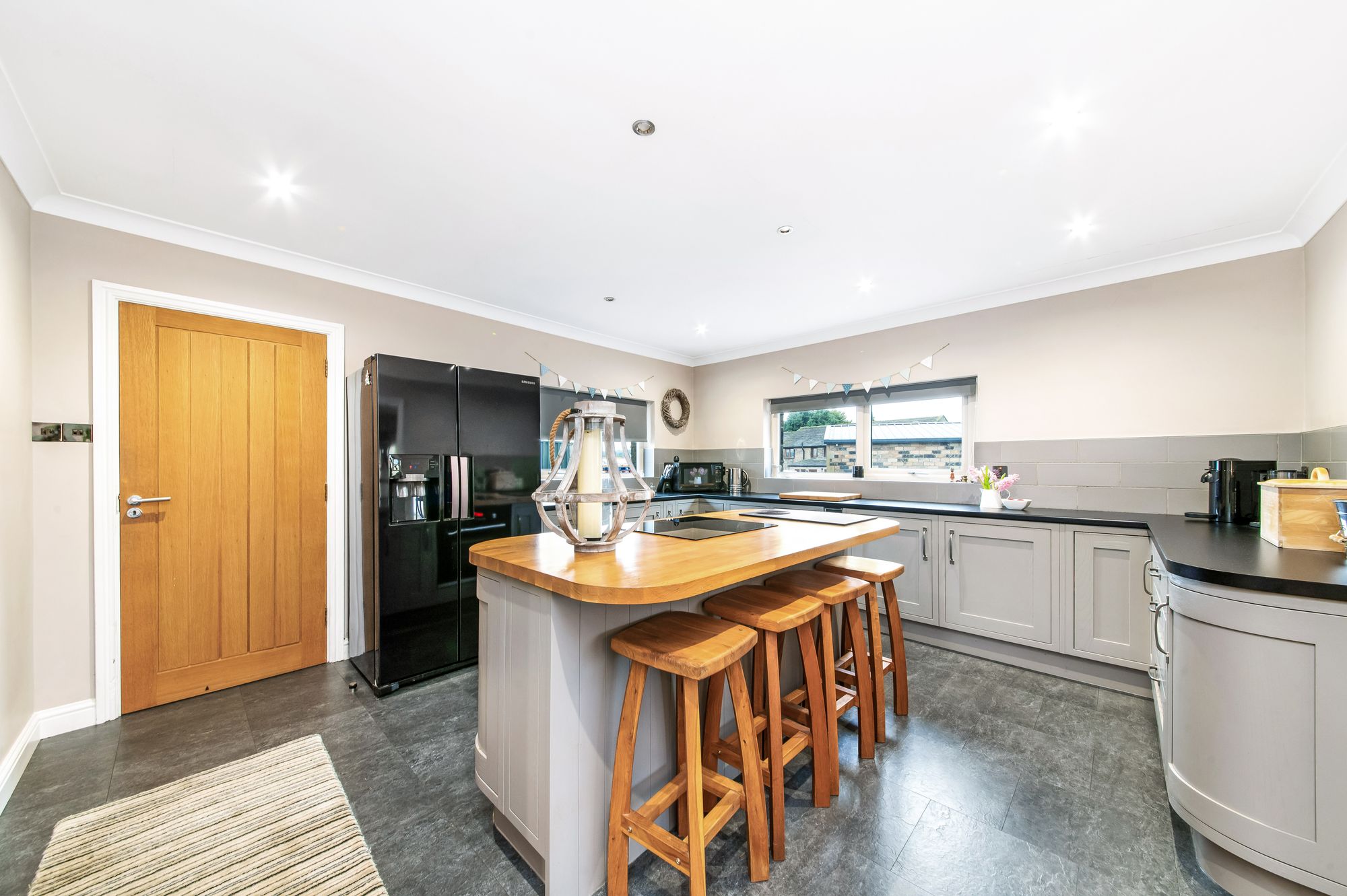 As the photography suggests, the breakfast kitchen room is a generous proportioned room which features dual aspect banks of windows to both the front and side elevations. There is a high quality fitted kitchen with fixed frame shaker style cupboard fronts and with contrasting work surfaces over which incorporate a one and a half bowl composite sink and drainer unit with mixer tap. The kitchen is equipped with built-in appliances which includes a slimline wine cooler, integrated dishwasher and the fabulous breakfast island features solid oak work surface which incorporates a four-ring ceramic induction hob and beneath a fan assisted oven. The kitchen features LVT flooring, decorative coving to the ceilings, inset spotlighting and a vertical column radiator. There is brick effect tiling to the splash areas and space and provisions for an American style fridge and freezer. Oak doors then provide access to the inner hallway and to the formal dining room.