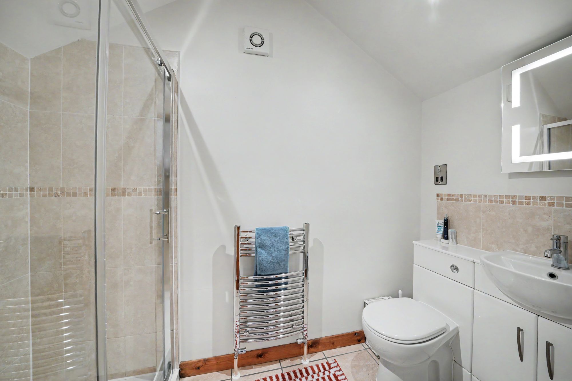 With a pitched ceiling with LED downlighters, extractor fan, shaver socket, chrome ladder style heated towel rail, tiled floor with under floor heating and fitted with a suite comprising vanity unit incorporating wash basin with chrome monobloc tap, tiled splashback and low flush w.c with concealed cistern together with a large shower with sliding glass door and chrome shower fitting.