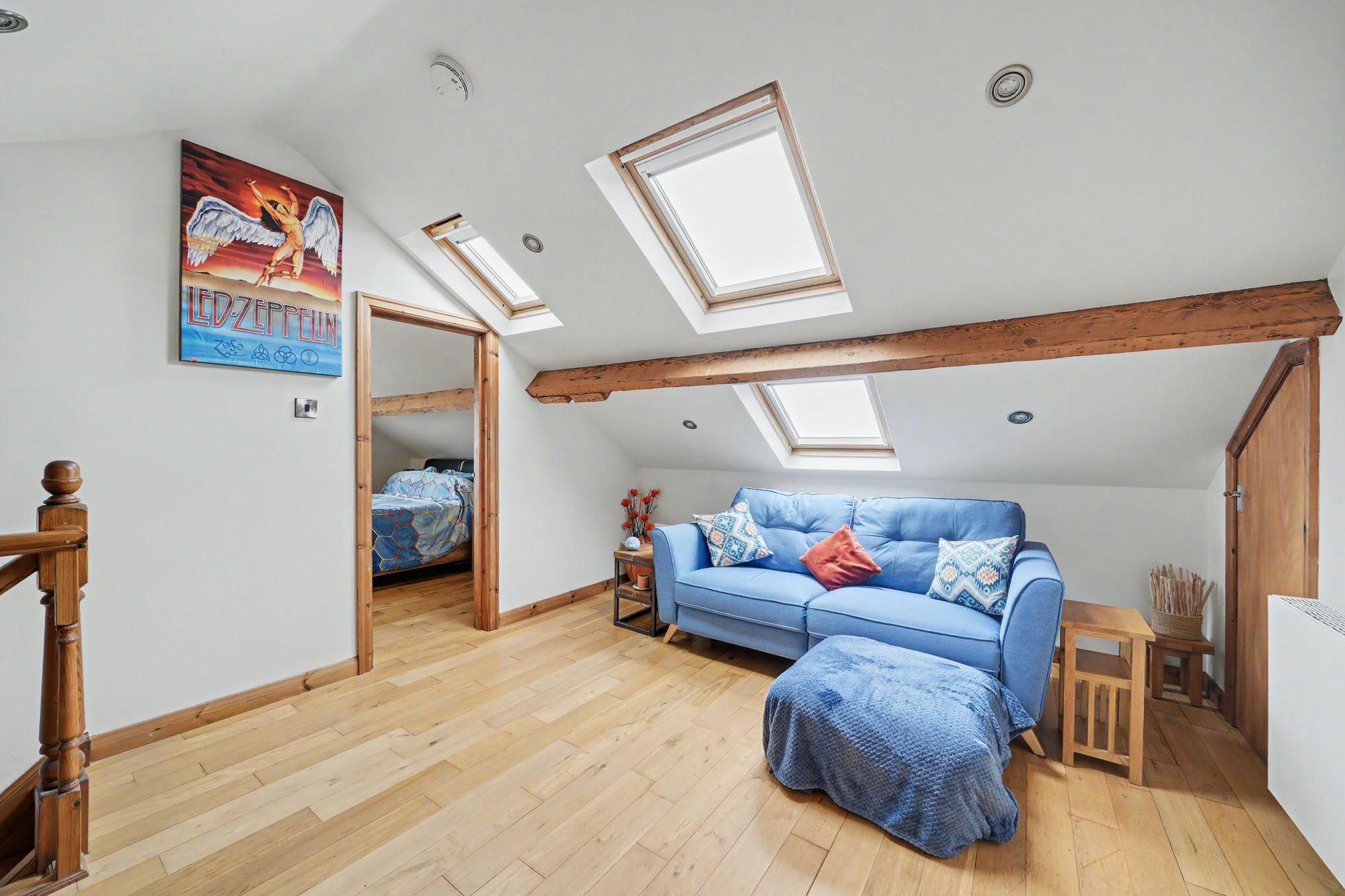 This has a pitched beamed ceiling with inset LED downlighters and three Velux double glazed windows which provide plenty of natural light with far reaching southerly views towards Castle Hill. There is a central heating radiator, oak flooring, two storage cupboards one of which houses the gas fired central heating boiler and between the storage cupboards there is a door giving access to a shower room.
